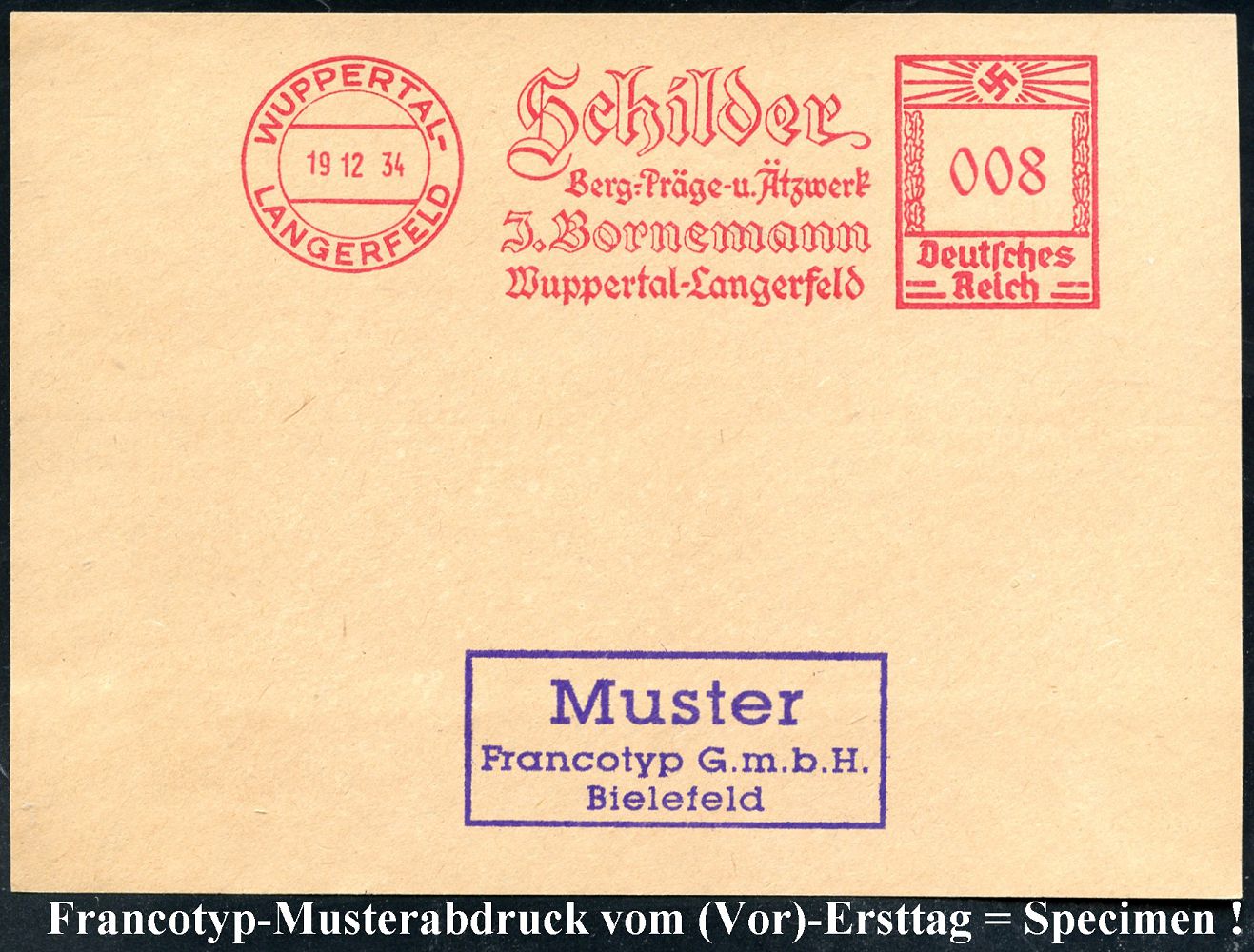 10202 | 35 € | 5600 WUPPERTAL (Absender-Freistempel) : WUPPERTAL-/ LAGERFELD/ Schilder/ Berg-Präge-u.Ätzwerk/ J.Bornemann.. 1934 (19.12.) AFS-Musterabdruck Francotyp "Hakenkreuz" , glasklar gest. Francotyp-Musterblatt vom (Vor)-Ersttag !, selten! (Dü.E-3CEo) | ![]() ![]() | |