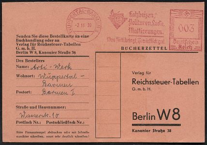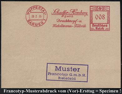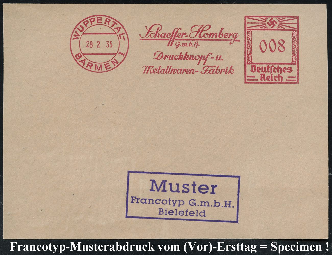 10204 | 35 € | 5600 WUPPERTAL (Absender-Freistempel) : WUPPERTAL-/ BARMEN 1/ Schaeffer-HOMBERG/ GmbH/ Druckknopf-u./ Metallwaren-Fabrik 1935 (28.2.) AFS-Musterabdruck Francotyp "Hakenkreuz" , glasklar gest. Francotyp-Musterblatt vom (Vor)-Ersttag !, selten! (Dü.E-3CEo) | ![]() ![]() | |