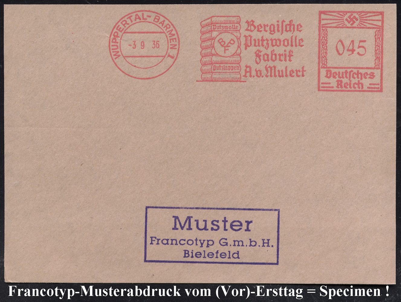 10212 | 35 € | 5600 WUPPERTAL (Absender-Freistempel) : WUPPERTAL-BARMEN 1/ Bergische/ Putzwolle/ Fabrik/ A.v.Mulert 1938 (3.9.) AFS-Musterabdruck Francotyp "Hakenkreuz" (Stapel Putzwolle) glasklar gest. Francotyp-Musterblatt vom (Vor)-Ersttag !, selten! (Dü.E-3CEo) | ![]() ![]() | |