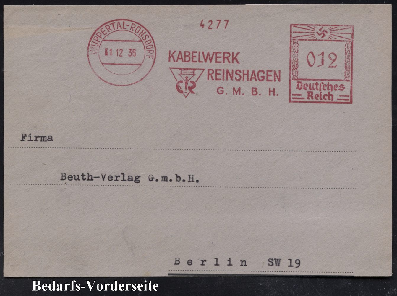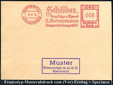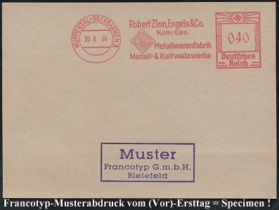 10211 | 35 € | 5600 WUPPERTAL (Absender-Freistempel) : WUPPERTAL-OBERBARMEN 1/ Robert Zinn,Engels & Co/ ..Metallwarenfabrik/ Metall- & Kaltwalzwerk 1936 (20.8.) AFS-Musterabdruck Francotyp "Hakenkreuz" (Firmenlogo) glasklar gest. Francotyp-Musterblatt vom (Vor)-Ersttag !, selten! (Dü.E-3CEo) | ![]() ![]() | |