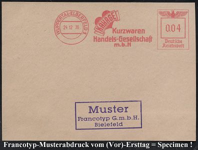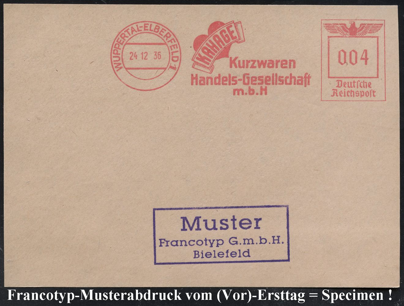 10215 | 35 € | 5600 WUPPERTAL (Absender-Freistempel) : WUPPERTAL-ELBERFELD 1/ KAHAGE/ Kurzwaren/ Handels-Ges./ mbH 1936 (24.12.) AFS-Musterabdruck Francotyp "Reichsadler" (Herz-Firmenlogo) glasklar gest. Francotyp-Musterblatt vom (Vor)-Ersttag !, selten! (Dü.E-5CGo) | ![]() ![]() | |