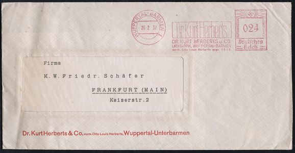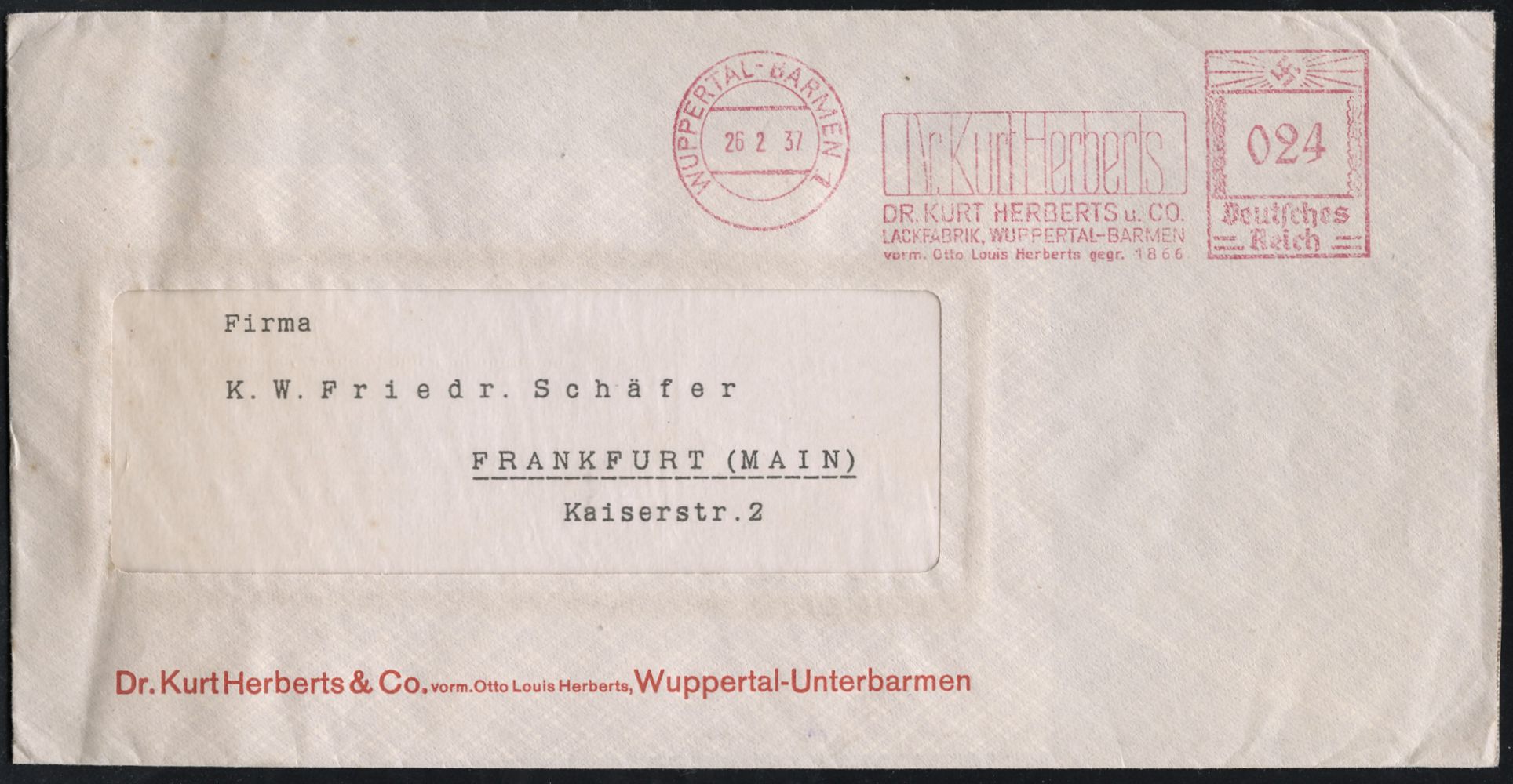 10220 | 20 € | 5600 WUPPERTAL (Absender-Freistempel) : WUPPERTAL-BARMEN 1/ Dr.Kurt Herberts../ LACKFABRIK.. 1937 (26.2.) AFS Francotyp "Hakenkreuz" auf Firmen-Fern-Bf. (Dü.E-3CEo) | ![]() | |