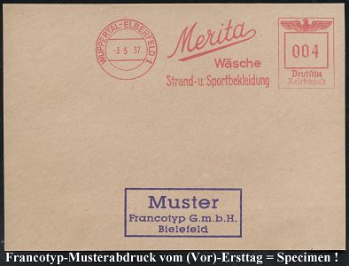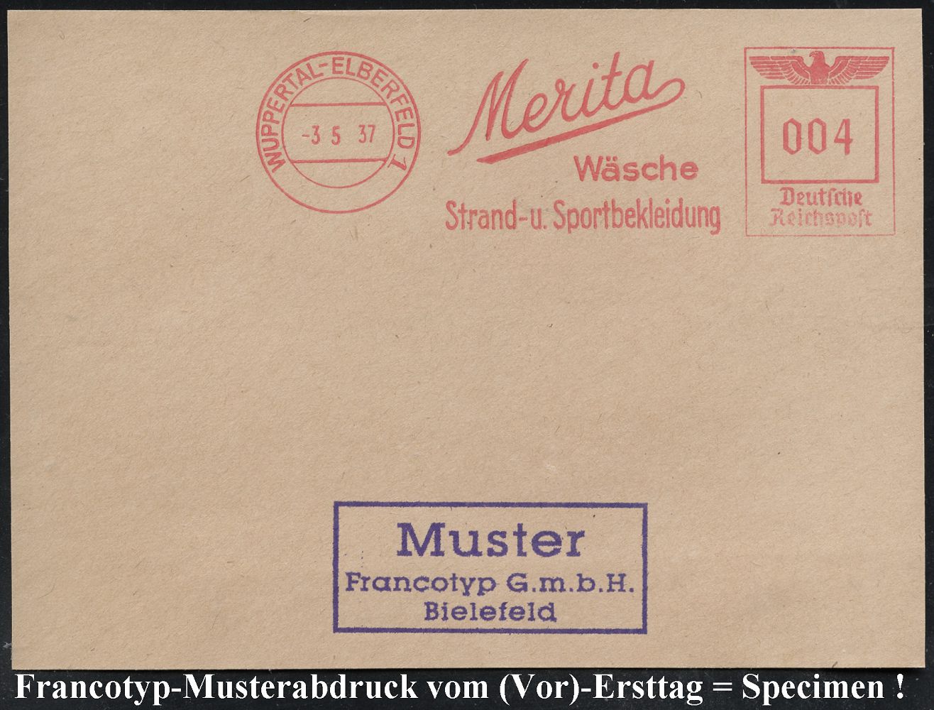 10223 | 35 € | 5600 WUPPERTAL (Absender-Freistempel) : WUPPERTAL-ELBERFELD 1/ Merita/ Wäsche/ Strand-u.Sportbekleidung 1937 (3.5.) AFS-Musterabdruck Francotyp "Reichsadler" , glasklar gest. Francotyp-Musterblatt vom (Vor)-Ersttag !, selten! (Dü.E-5CGo) | ![]() ![]() | |