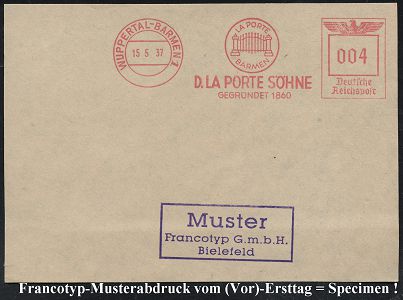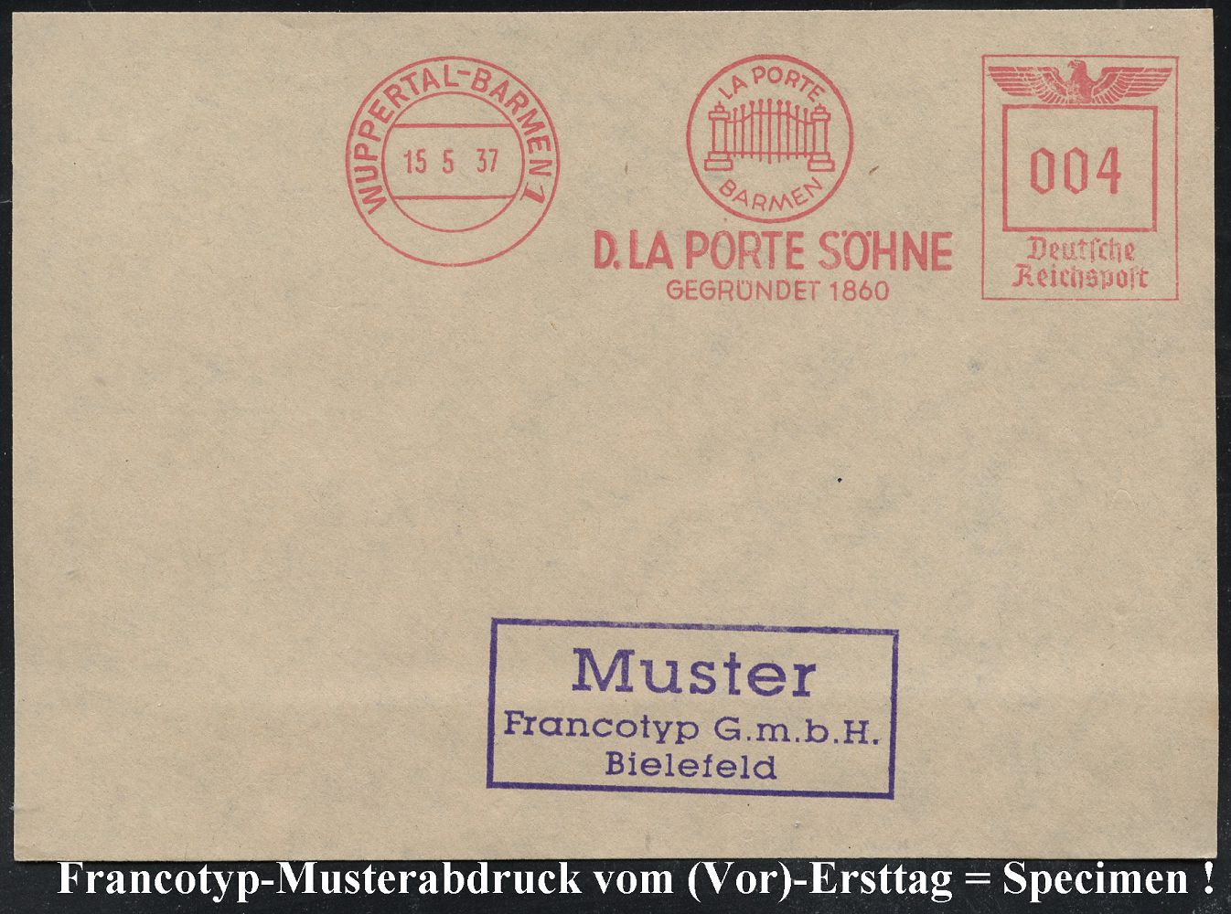10225 | 35 € | 5600 WUPPERTAL (Absender-Freistempel) : WUPPERTAL-BARMEN 1/ LA PORTE../ D.LA PORTE SÖHNE/ GEGRÜNDET 1860 1937 (15.5.) AFS-Musterabdruck Francotyp "Reicsadler" (Firmenlogo: Eisenportal) glasklar gest. Francotyp-Musterblatt vom (Vor)-Ersttag !, selten! (Dü.E-5CGo) | ![]() ![]() | |