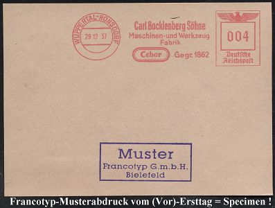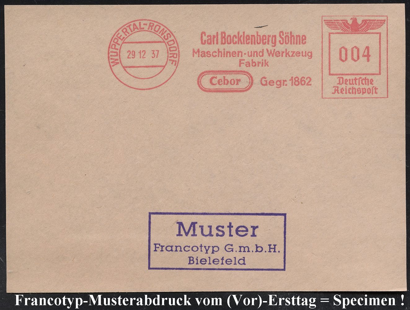 10233 | 35 € | 5600 WUPPERTAL (Absender-Freistempel) : WUPPERTAL-RONSDORF/ Carl Bocklenberg Söhne/ Maschinen- u.Werkzeug/ Fabrik/ Cebor.. 1937 (29.12.) AFS-Musterabdruck Francotyp "Reichsadler" (Firmenlogo) glasklar gest. Francotyp-Musterblatt vom (Vor)-Ersttag !, selten! (Dü.E-5CGo) | ![]() ![]() | |