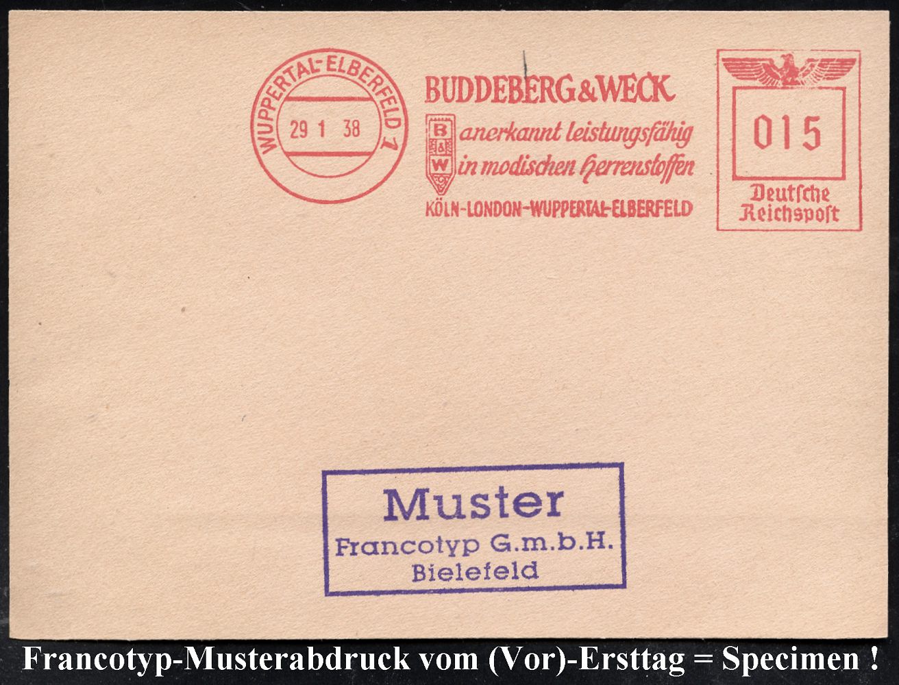 10235 | 35 € | 5600 WUPPERTAL (Absender-Freistempel) : WUPPERTAL-ELBERFELD 1/ BUDDENBERG & WECK/ ..in modischen Herrenstoffen/ KÖLN-LONDON-WUPPERTAL-ELBERFELD 1938 (29.1.) AFS-Musterabdruck Francotyp "Reichsadler" (Monogr.-Logo) glasklar gest. Francotyp-Musterblatt vom (Vor)-Ersttag !, selten! (Dü.E-5CGo) | ![]() ![]() | |