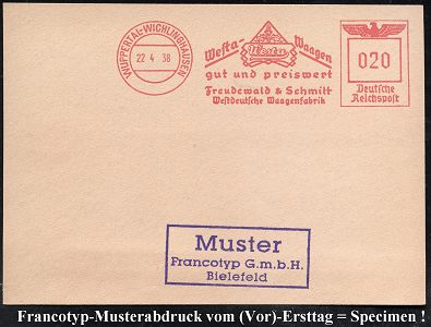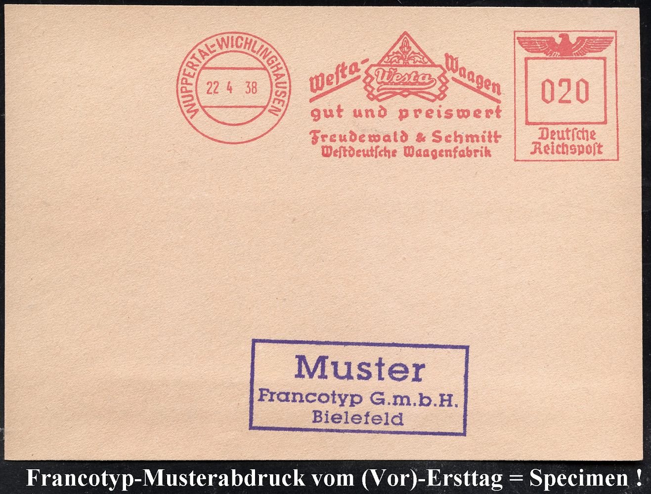 10238 | 35 € | 5600 WUPPERTAL (Absender-Freistempel) : WUPPERTAL-WICHLINGHAUSEN/ Westa-Waagen/ gut u.preiswert/ Freudewald & Schmidt/ Westdeutsche Waagenfabrik 1938 (22.4.) AFS-Musterabdruck Francotyp "Reichsadler" (Firmenlogo mit Eichel) glasklar gest. Francotyp-Musterblatt vom (Vor)-Ersttag !, selten! (Dü.E-5CGo) | ![]() ![]() | |