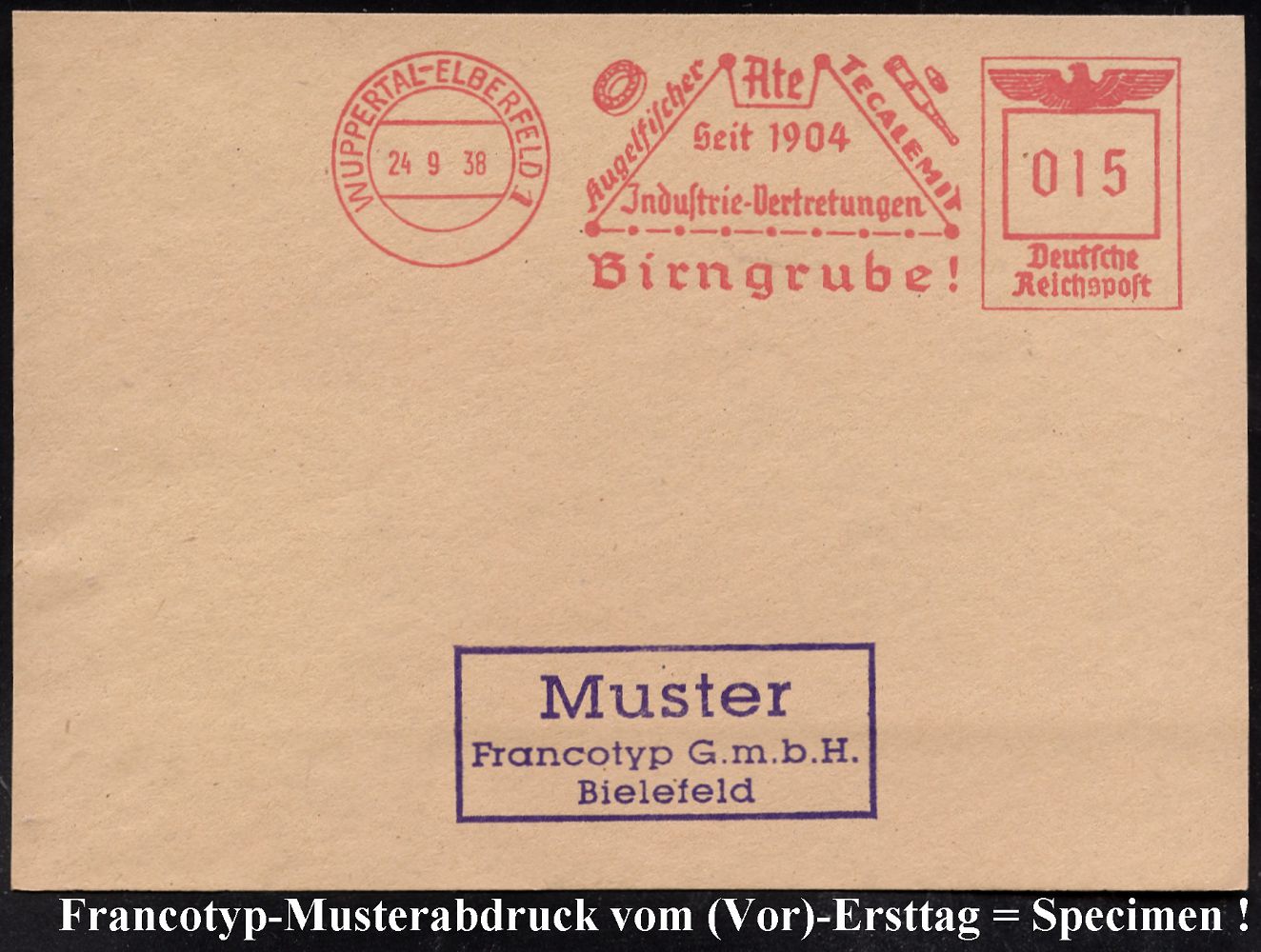 10240 | 35 € | 5600 WUPPERTAL (Absender-Freistempel) : WUPPERTAL-ELBERFELD 1/ Augelfischer/ TECALEMIT/ Ate/ Seit 1904/ Jndustrie-Vertretungen/ Birngrube! 1938 (24.9.) AFS-Francotyp Francotyp "Reichsadler" (Kugellager, Abschierspritze) glasklar gest. Francotyp-Musterblatt vom (Vor)-Erstag !, selten! (Dü.E-5CGo) | ![]() ![]() | |