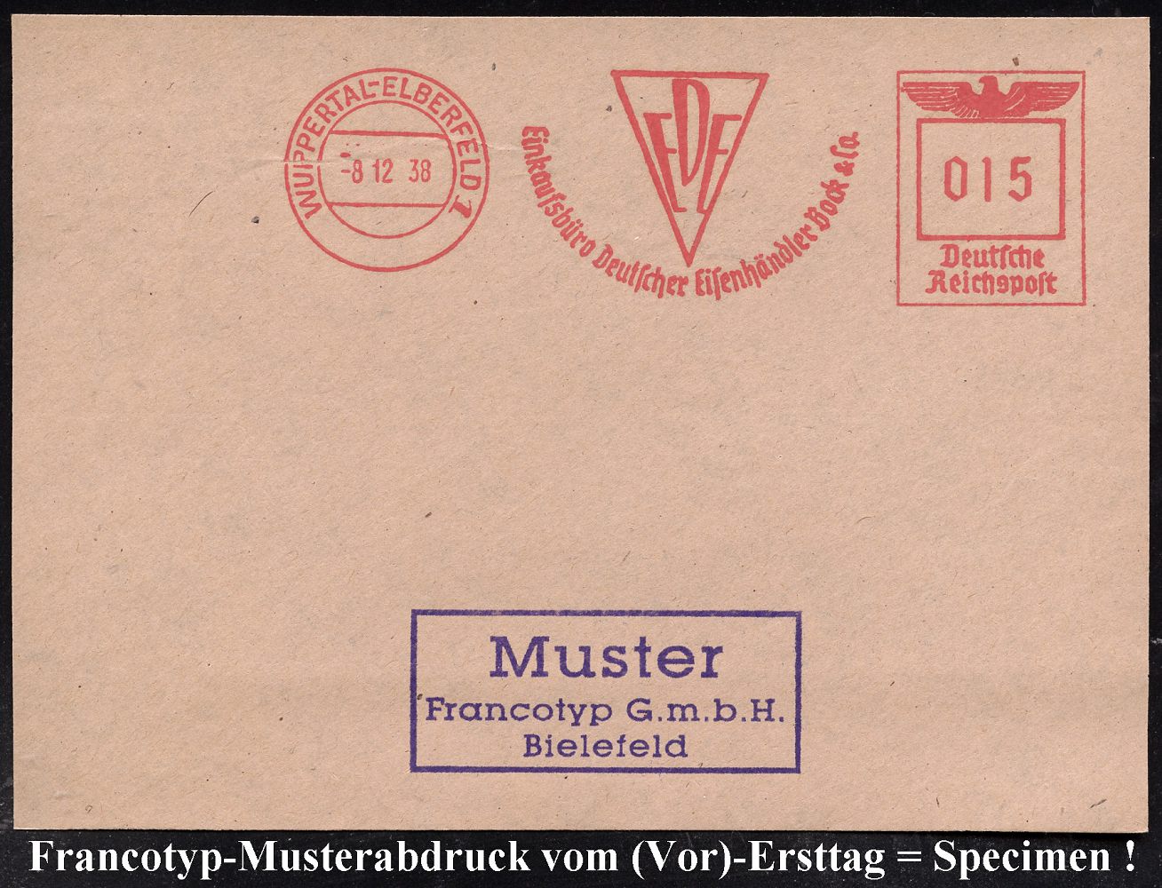 10246 | 35 € | 5600 WUPPERTAL (Absender-Freistempel) : WUPPERTAL-ELBERFELD 1/ EDE/ Einkaufsbüro Deutscher Eisenhändler Bock & Co 1938 (8.12.) AFS-Musterabdruck Francotyp "Reichsadler" (Monogr.-Logo) glasklar gest. Francotyp-Musterblatt vom (Vor)-Ersttag !, selten! (Dü.E-5CGo) | ![]() ![]() | |