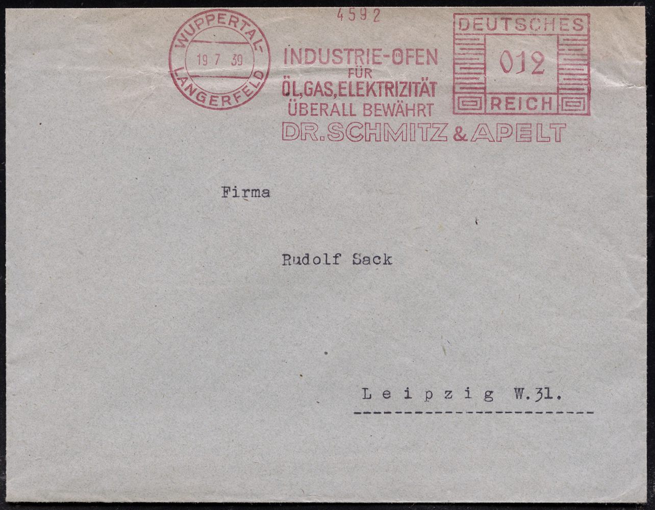 10250 | 20 € | 5600 WUPPERTAL (Absender-Freistempel) : WUPPERTAL-/ LANGERFELD/ INDUSTRIE-ÖFEN/ FÜR/ ÖL,GAS,ELEKTRIZITÄT../ DR.SCHMITZ & APPELT 1939 (19.7.) AFS Francotyp "Mäanderrechteck" (schwache Falte) Firmen-Fernbf. (Dü.E-2CEh mit 2K-Ortsstempel) | ![]() | |