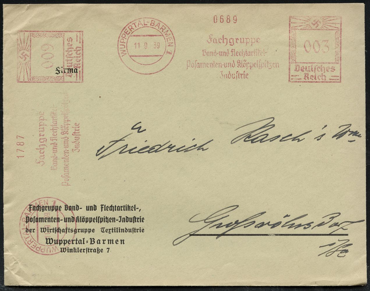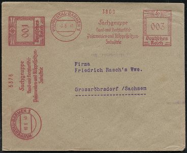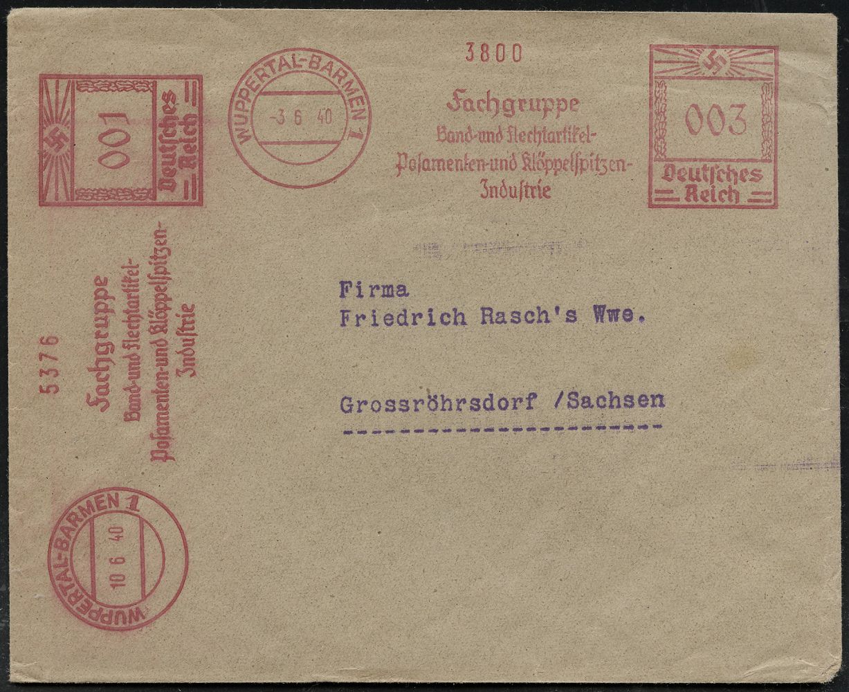 10256 | 28 € | 5600 WUPPERTAL (Absender-Freistempel) : WUPPERTAL-BARMEN 1/ Fachgruppe/ Band- u.Flechtartikel/ Posamenten- u. Klöppelspitzen/ Jndustrie 1940 (3.6.) AFS Francotyp "Hakenkreuz" 003 Pf. + 001 Pf. = 2 Abdrucke! , klar gest. Fern-Bf., seltener Beleg! (Dü.E-3CE2) | ![]() | |