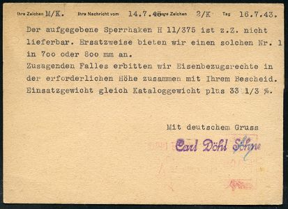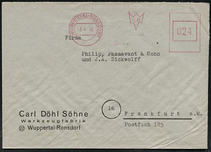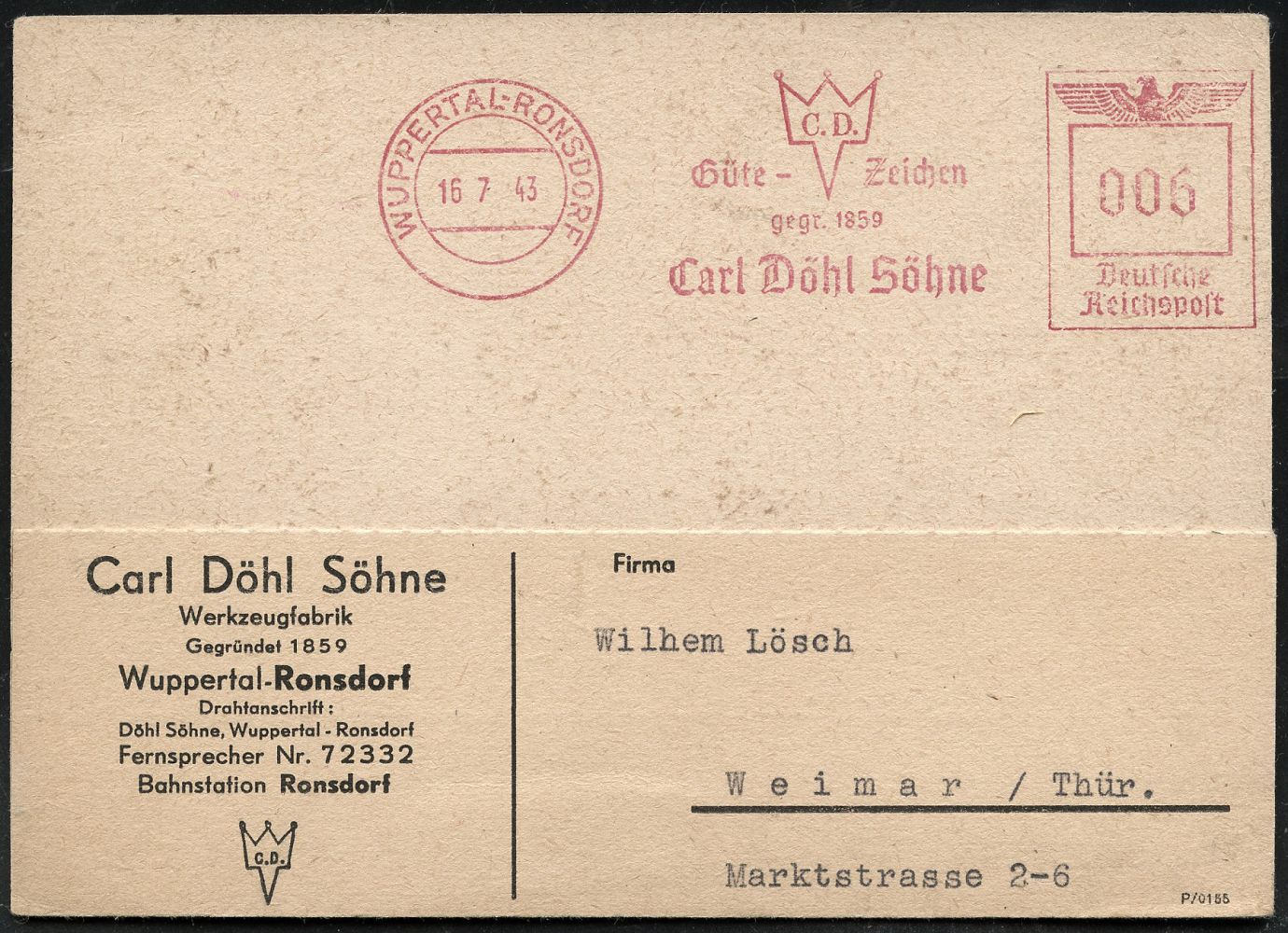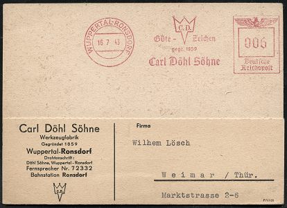 10258 | 25 € | 5600 WUPPERTAL (Absender-Freistempel) : WUPPERTAL-RONSDORF/ C.D./ Güte-Zeichen/ gegr.1859/ Carl Döhl Söhne 1943 (16.7.) AFS Francotyp "Reichsadler" (Firmen-Logo) motivgl. Firmen-Kt.: Carl Döhl Söhne, Werkzeugfabrik.., rs. Text über "Eisenbezugsrechte" während des II. Weltkrieges!, vergl. Kat.-Nr. 10232 u. 10263 (Dü.E-5CGo) | ![]() ![]() | |