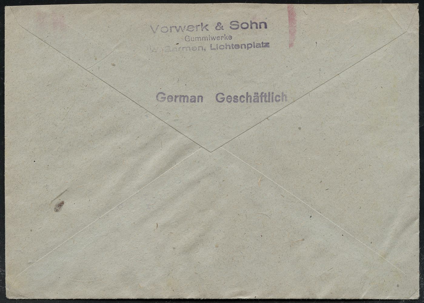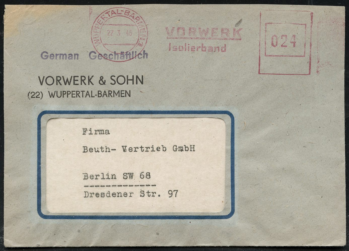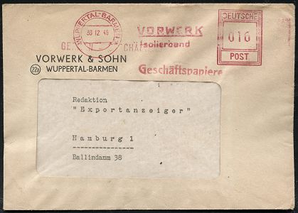 10261 | 20 € | 5600 WUPPERTAL (Absender-Freistempel) : WUPPERTAL-BARMEN 1/ VORWERK/ Isolierband 1946 (22.3.) aptierter AFS Francotyp "Reichsadler" = entfernt = Notmaßnahme! , Firmen-Bf. (kl. Eckbräung) rs. Abs.-3L: Vorwerk & Sohn/ Gummiwerke.. (Dü.E-13 AK-129o) | ![]() ![]() | |