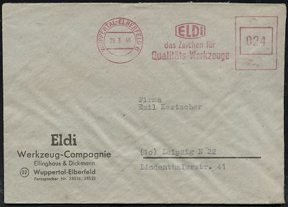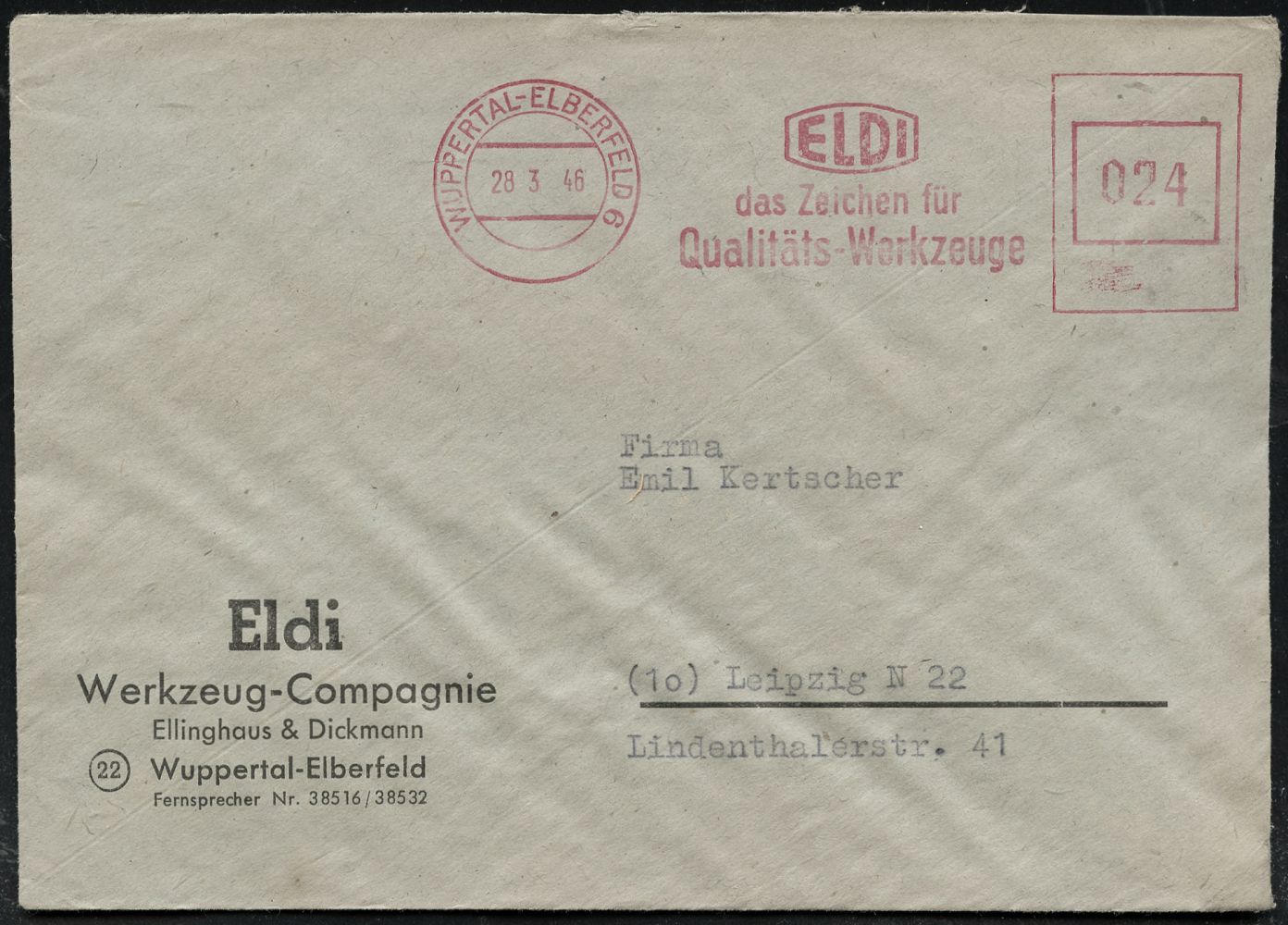 10262 | 25 € | 5600 WUPPERTAL (Absender-Freistempel) : WUPPERTAL-ELBERFELD 6/ ELDI/ das Zeichen für/ Qualitäts-Werkzeuge 1946 (28.3.) aptierter AFS Francotyp "Reichsadler" = entfernt = Notmaßnahme! (Monogr.-Logo) Firmen-Bf.: Eldi, Werkzeug-Compagnie, Ellinghaus & Dickmann.. in die SBZ (Dü.E-13 AK-129o) | ![]() | |