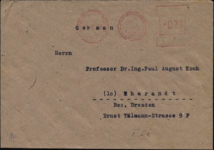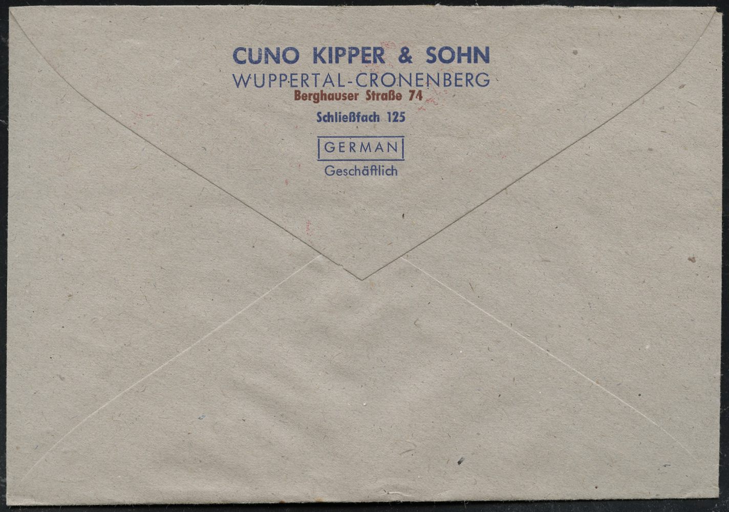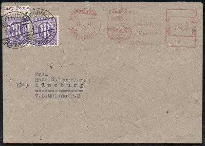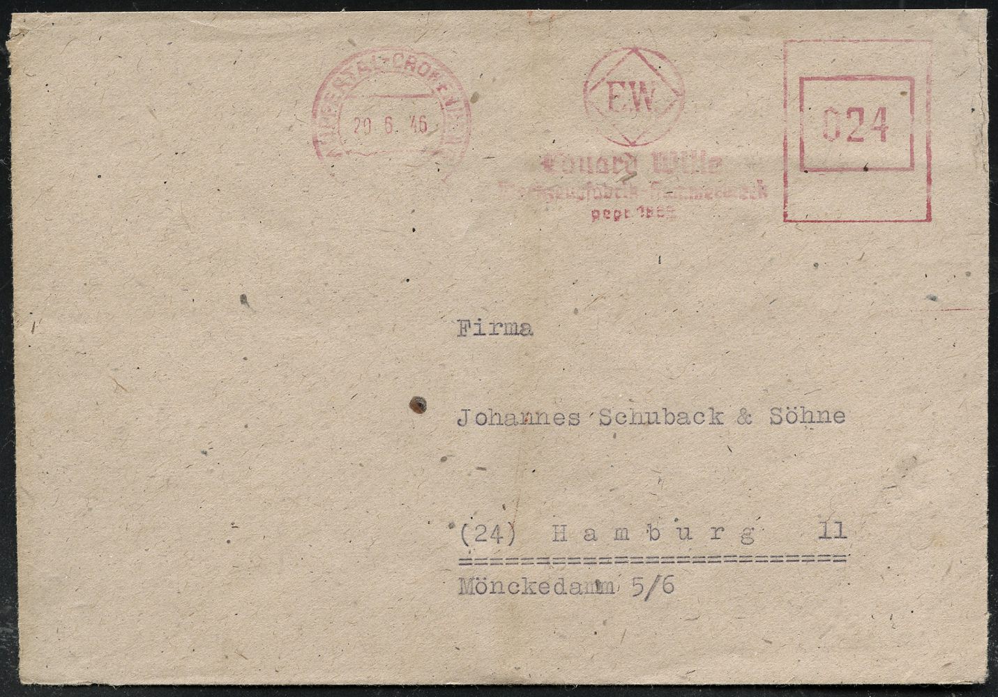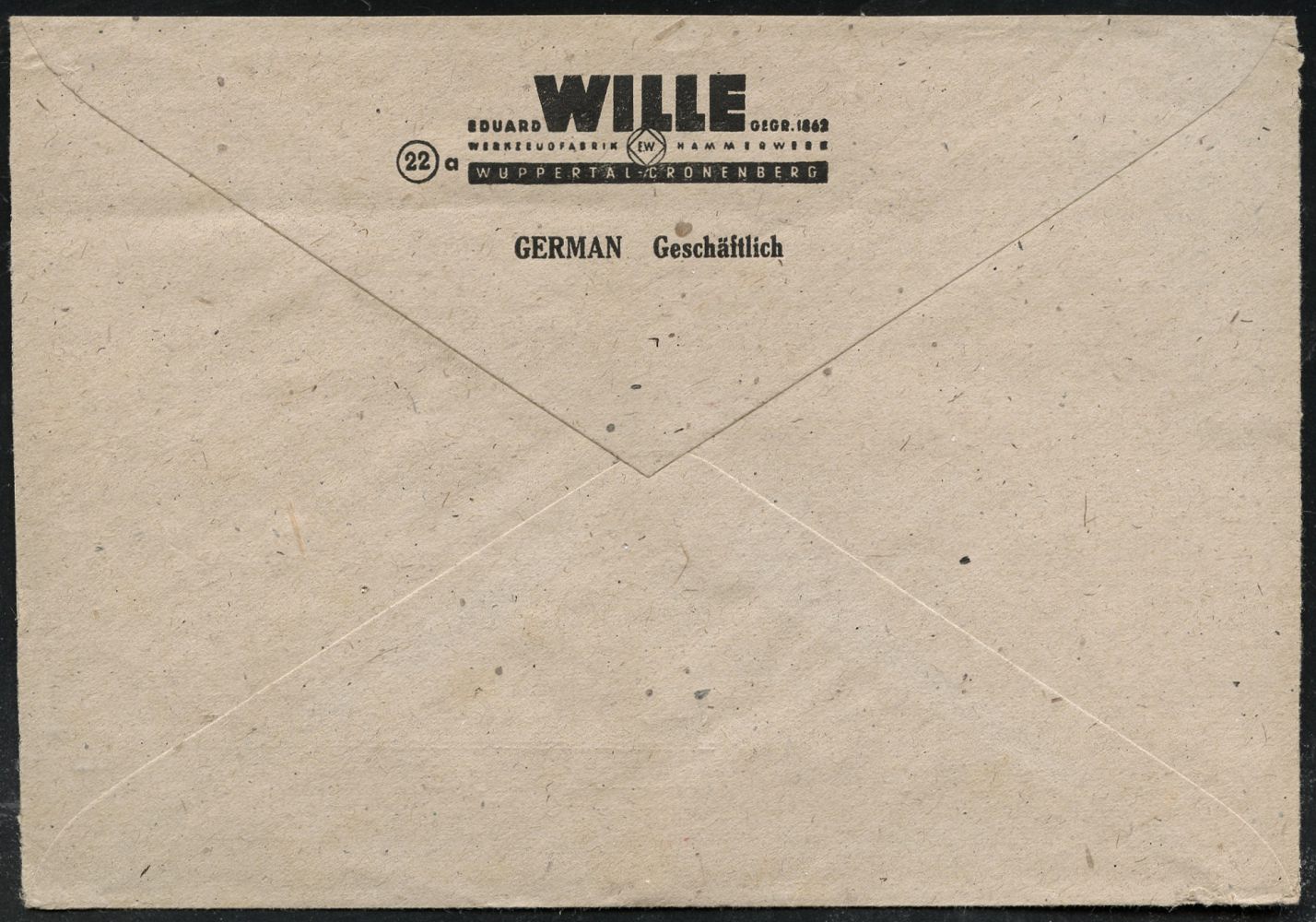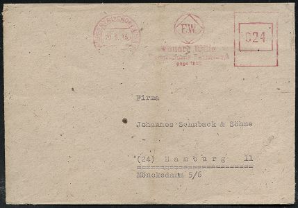 10264 | 20 € | 5600 WUPPERTAL (Absender-Freistempel) : WUPPERTAL-CRONENBERG/ F.W./ Eduard Wille/ Werkzeugfabrik Hammerwerk.. 1946 (20.6.) aptierter AFS Francotyp "Reichsadler" = entfernt = Notmaßnahme! (Monogr.-Logo) zeitbedingt etw. schwach, rs. Abs.-Vordruck, Fern-Bf. (kl. Randmäng.) n. Hamburg (Dü.E-13 AK-129o) | ![]() ![]() | |