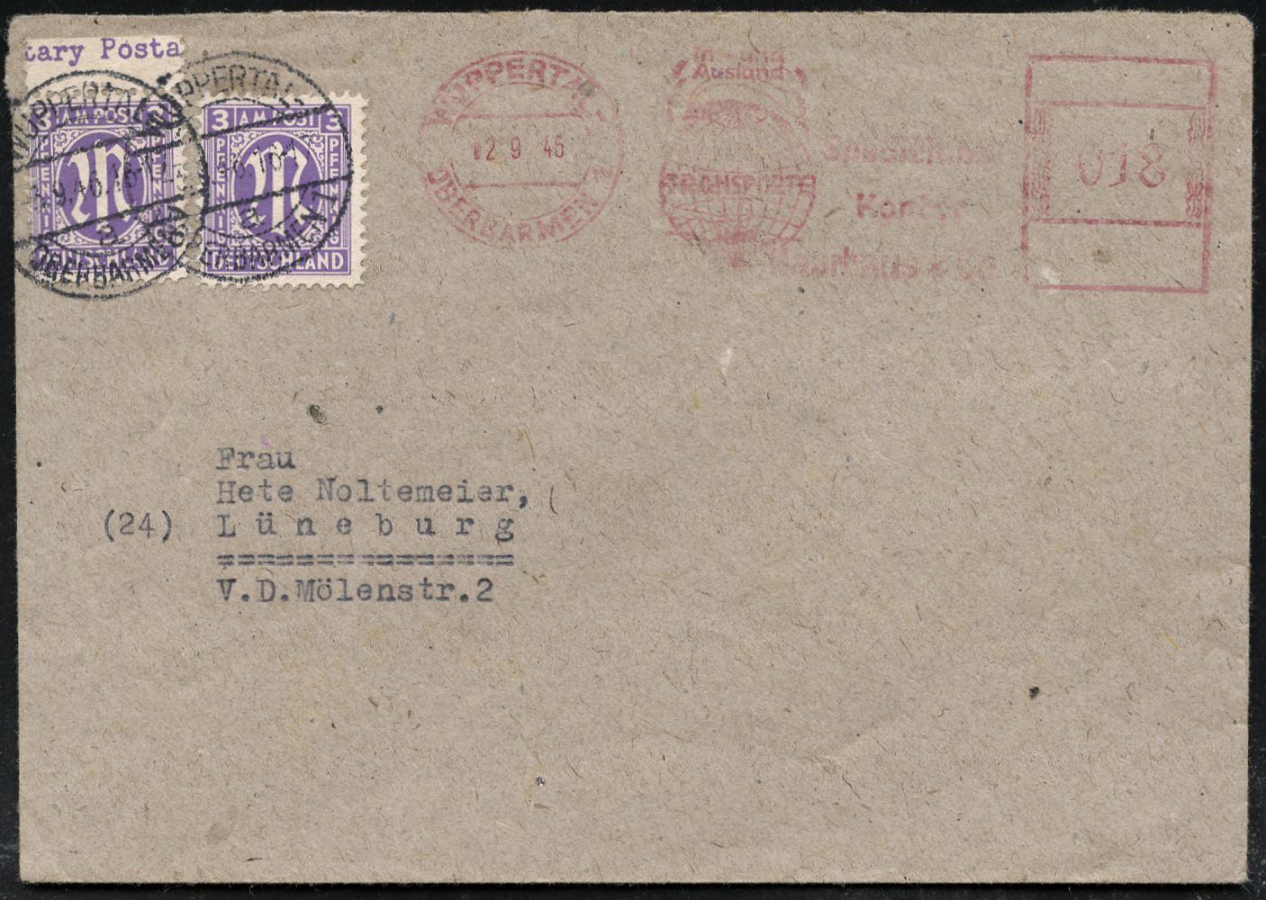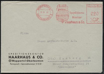 10266 | 35 € | 5600 WUPPERTAL (Absender-Freistempel) : WUPPERTAL-/ OBERBARMEN/ In-u./ Ausland-/ TRANSPORTE/ Spedition/ Kontor/ Haarhaus & Co. 1946 (2.9.) seltener, aptierter AFS Francotyp "Hakenkreuz" = entfernt + Inschrift "Deutsches Reich" = Notmaßnahme! 018 Pf. (Firmenlogo: Globus) zeitbedingt etw. abgenutzt + Zusatz-Frankatur 2x 3 Pf. AM-Post (1x Randstück) gest. 1K-Brücke: WUPPERTAL-/OBERBARMEN/a, seltener Fern-Bf. in MiF = Fernporto 24 Pf., vergl. Kat.Nr. 10277 (Dü.E-12 AA-98o) | ![]() | |