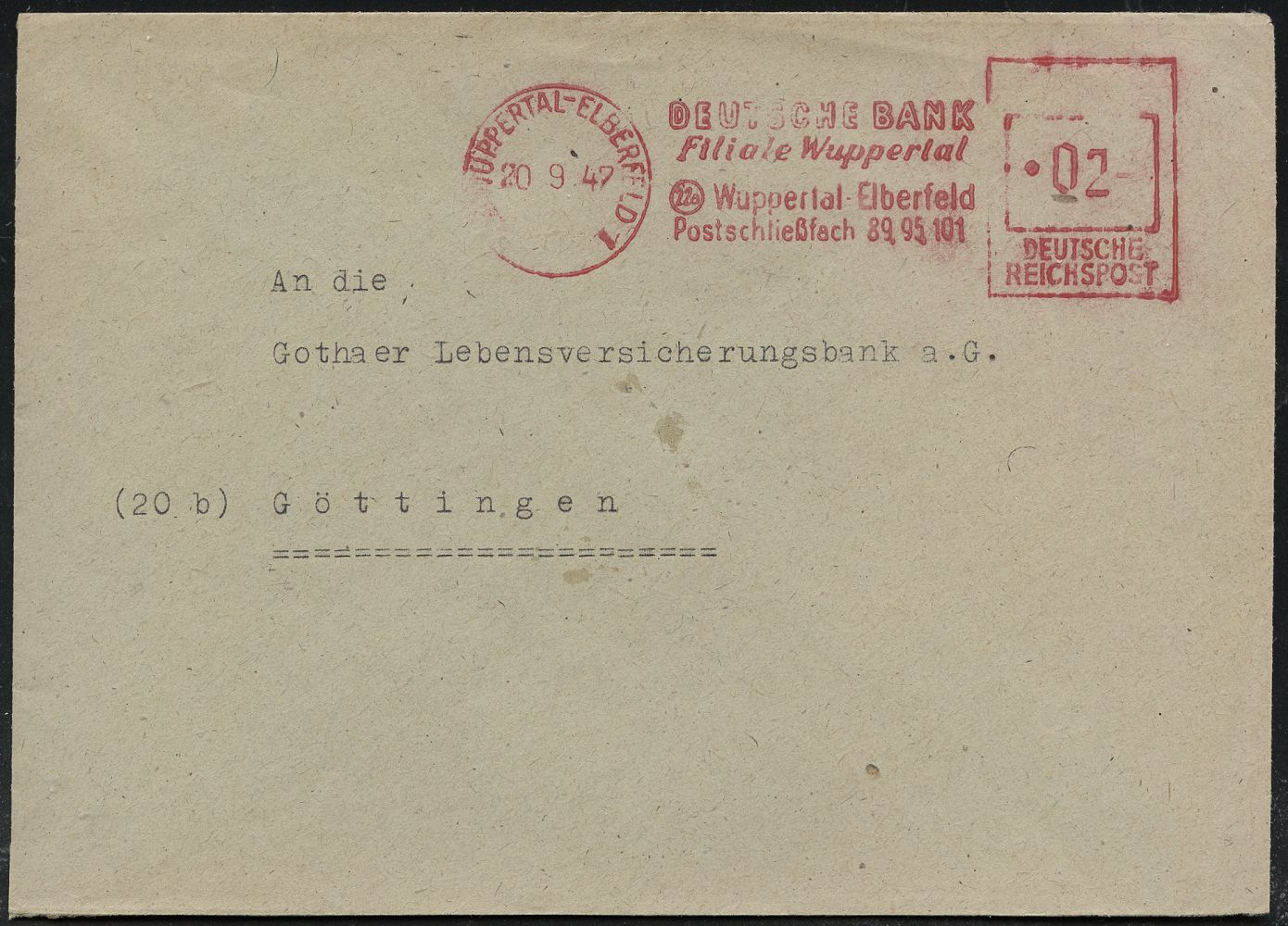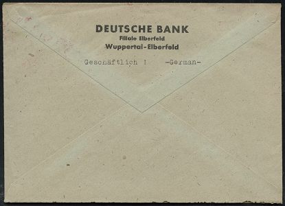 10272 | 25 € | 5600 WUPPERTAL (Absender-Freistempel) : (22a) WUPPERTAL-ELBERFELD 1/ DEUTSCHE BANK/ Filiale Wuppertal.. 1947 (20.9.) aptierter AFS Francotyp "Reichsadler" = entfernt, Antiqua-Inschrift "DEUTSCHE REICHSPOST" = Notmaßnahme! , rs. Abs.-Vordruck, Fern-Bf. (Dü.E-14 C-231o) | ![]() ![]() | |