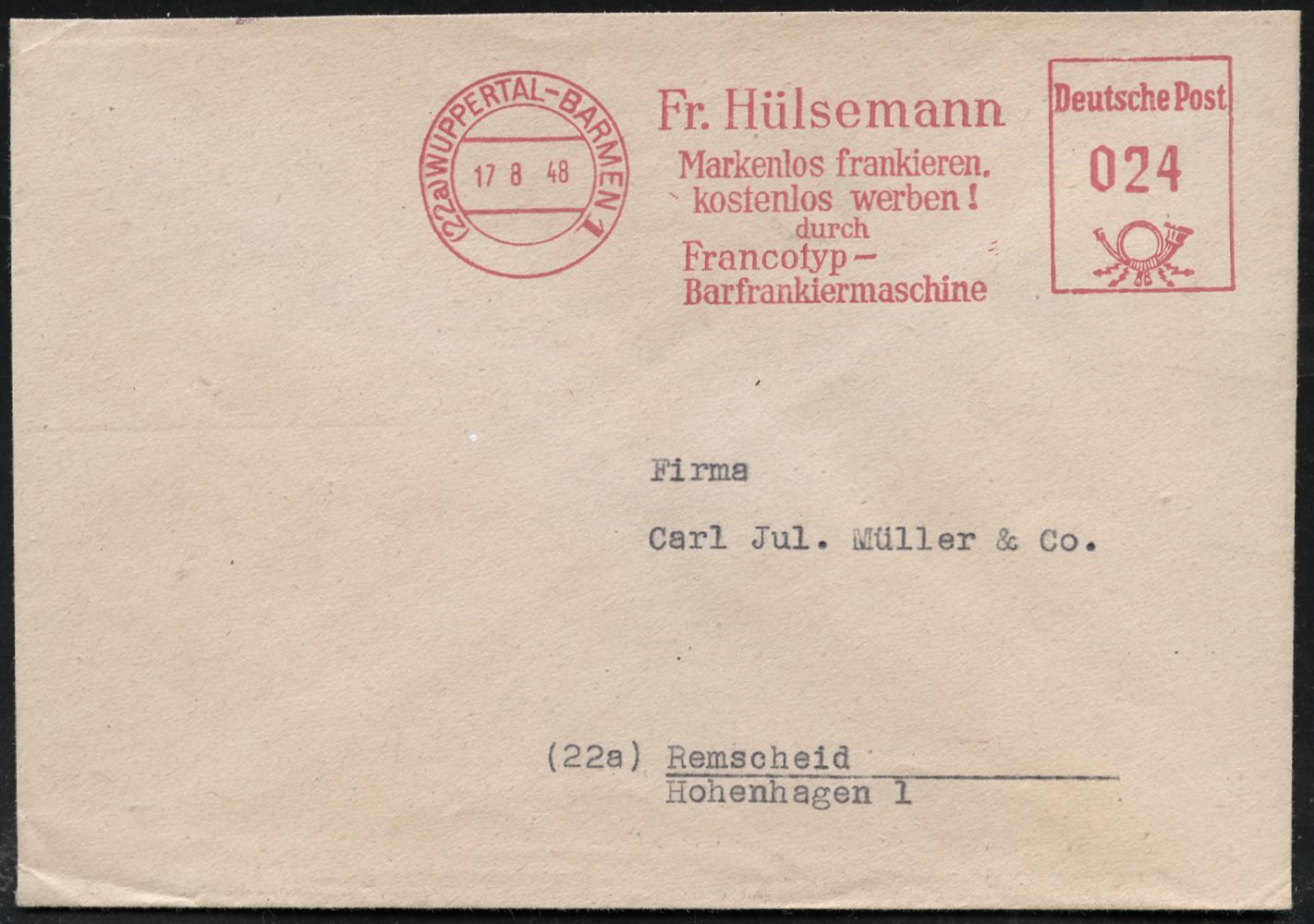 10273 | 20 € | 5600 WUPPERTAL (Absender-Freistempel) : (22a) WUPPERTAL-BARMEN 1/ Fr.Hülsemann/ Markenlos frankieren,/ kostenlos werben!/ durch/ Francotyp/ Barfrankiermaschine 1948 (17.8.) AFS Francotyp "Posthorn" , rs. Abs.-Vordruck, Fern-Bf. (Dü.E-20CG mit A-Rahmen !) | ![]() ![]() | |