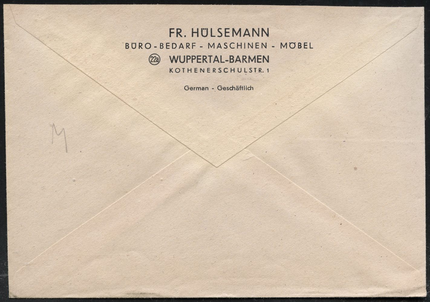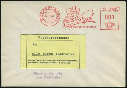 10296 | 50 € | 5600 WUPPERTAL (Absender-Freistempel) : (22a) WUPPERTAL-BARMEN 1/ Fritz Vogel 1962 (23.11.) AFS Francotyp "Posthorn" 003 Pf. klar auf Postwurfsendung: An alle Büros.. sehr seltene, niedrigste Portostufe! (Götz: Lp. !) | ![]() | |