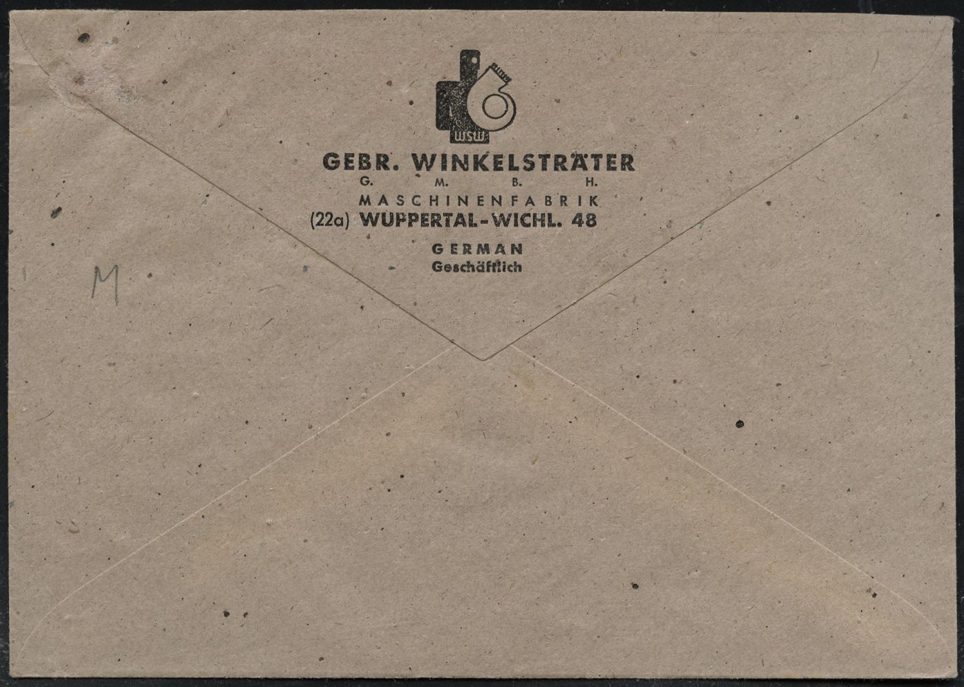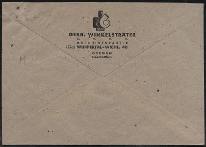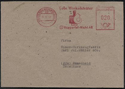 10274 | 18 € | 5600 WUPPERTAL (Absender-Freistempel) : (22) WUPPERTAL-WICHLINGHAUSEN/ Gebr.Winkelsträter/ WSW.. 1948 (31.12.) AFS Francotyp "Posthorn" (Firmenlogo: stilis, Belüftungs-Figur) rs. motivgl. Abs.-Vordruck: GEBR. WINKELSTRÄTER GMBH, MASCHINENFABRIK.., vergl. Kat.-Nr. 10270 (Dü.E-20CG) | ![]() ![]() | |