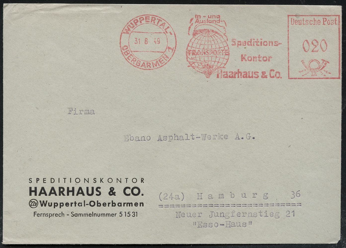 10276 | 16 € | 5600 WUPPERTAL (Absender-Freistempel) : WUPPERTAL-/ OBERBARMEN 1/ In-u./ Ausland-/ TRANSPORTE/ Speditions-/ Kontor/ Haarhaus & Co. 1949 (31.8.) AFS Francotyp "Posthorn" (Globus) Firmen-Bf. n. Hamburg, vergl. Kat.-Nr. 10266 (Dü.E-20CE) | ![]() | |