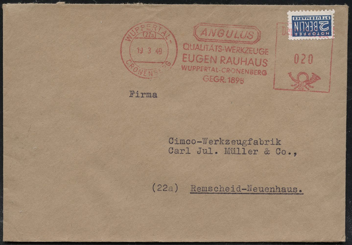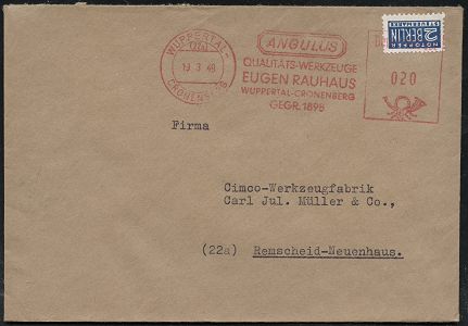 10277 | 18 € | 5600 WUPPERTAL (Absender-Freistempel) : (22a) WUPPERTAL-/ CRONENBERG/ ANGULUS/ QUALITÄTS-WERKZEUGE/ EUGEN RAUHAUS.. 1949 (19.3.) AFS Postalia "Posthorn" mit Inschrift "Deutsche Post" 020 Pf. auf 2 Pf. NoB (= Vorausentwertung) rs. Abs.-Vordruck, Fern-Bf. + Info-Faksimile (Dü.E-20 B) | ![]() ![]() | |