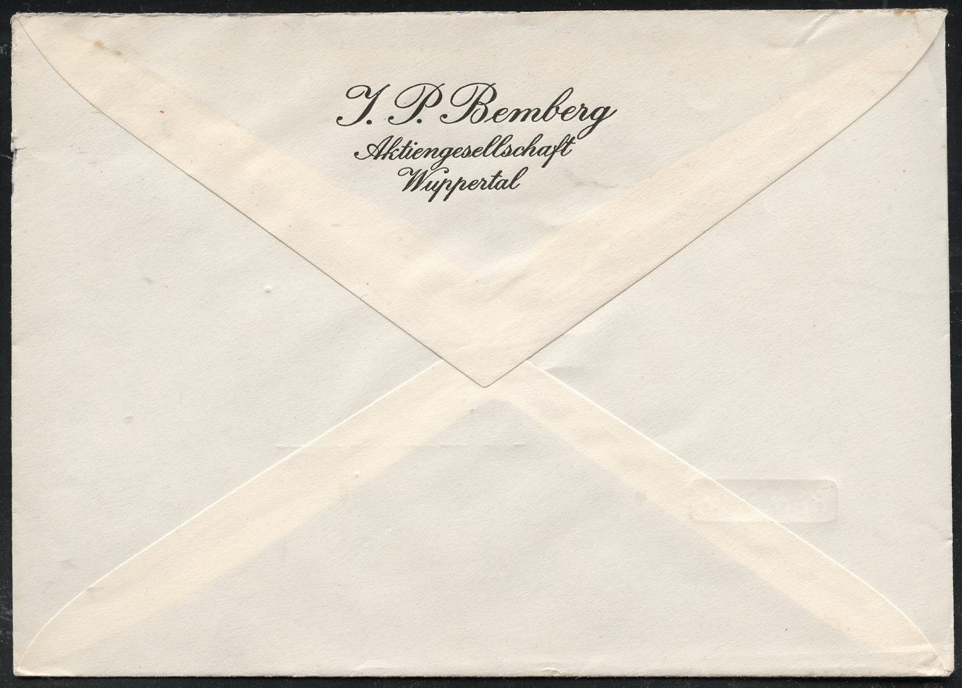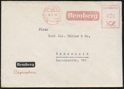 10278 | 15 € | 5600 WUPPERTAL (Absender-Freistempel) : (22) WUPPERTAL-OBERBARMEN/ Bemberg 1950 (18.2.) AFS Francotyp auf zweifarbigem Firmen-Bf.: Bemberg Cuprophan, rs. Abs.-Vordruck = Textifirma für Seide u. Kunstseide (Dü.E-20CG) | ![]() ![]() | |