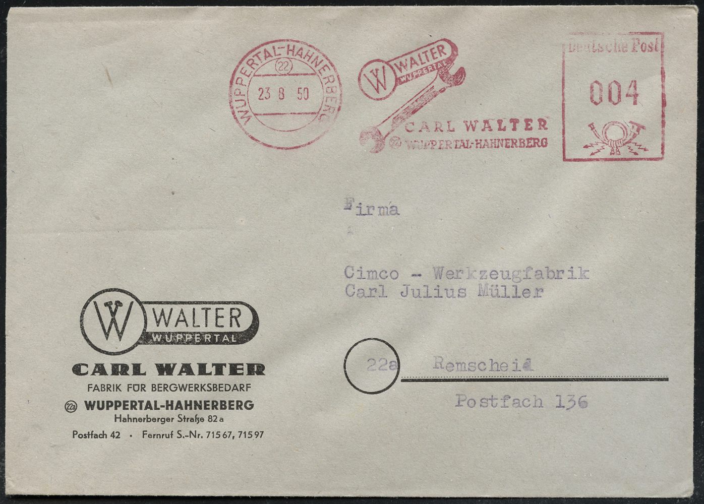 10279 | 16 € | 5600 WUPPERTAL (Absender-Freistempel) : (22) WUPPERTAL-HAHNERBERG/ ::CARL WALTER.. 1950 (23.8.) AFS Francotyp (Schraubschlüssel) Firmen-Bf.: CARL WALTER, FABRIK FÜR BERGWERKSBEDARF.. (Dü.E-20CG) | ![]() | |