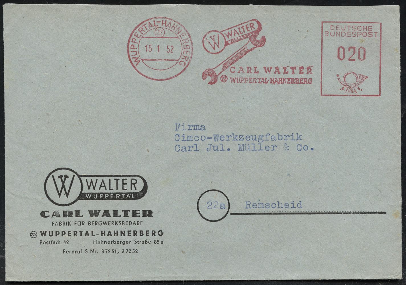 10282 | 16 € | 5600 WUPPERTAL (Absender-Freistempel) : (22) WUPPERTAL-HAHNERBERG/ ::CARL WALTER.. 1952 (15.1.) AFS Francotyp "Posthorn" mit Inschrift "DEUTSCHE BUNDESPOST" (Schraubschlüssel) auf Firmen-Bf.: CARL WALTER, FABRIK FÜR BERGWERKSBEDARF.., vergl. Kat.-Nr. 10279 (Dü.E-23CG) | ![]() | |