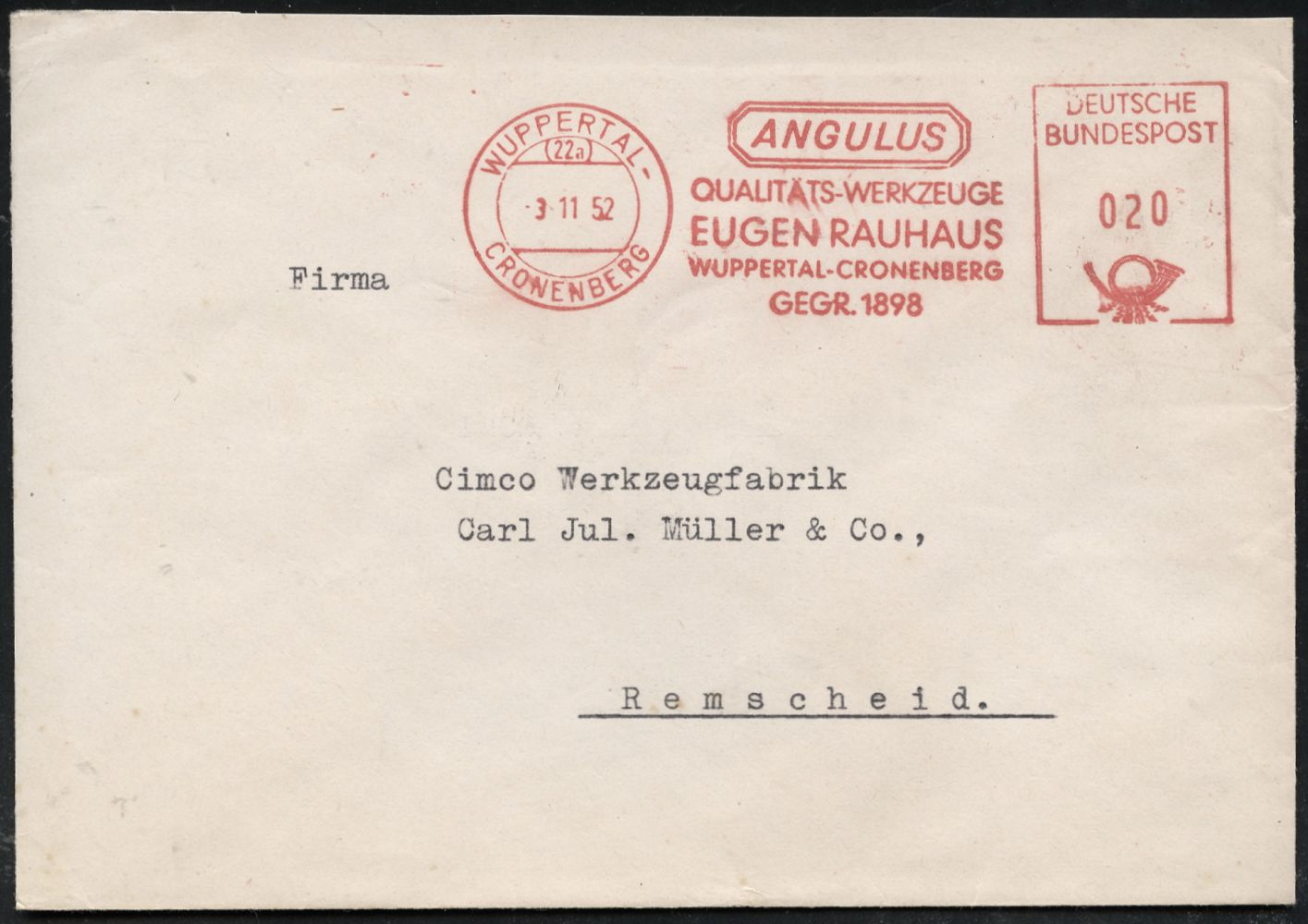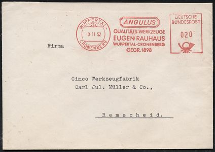 10284 | 15 € | 5600 WUPPERTAL (Absender-Freistempel) : (22a) WUPPERTAL-/ CRONENBERG/ ANGULUS/ QUALITÄTS-WERKZEUGE/ EUGEN RAUHAUS.. 1952 (3.11.) AFS Postalia "Posthorn" mit Inschrift "DEUTSCHE BUNDESPOST" , klar gest. Fern-Bf. + Postalia-Faksimile, vergl. Kat.-Nr. 10277 (Dü.E-23 B) | ![]() ![]() | |