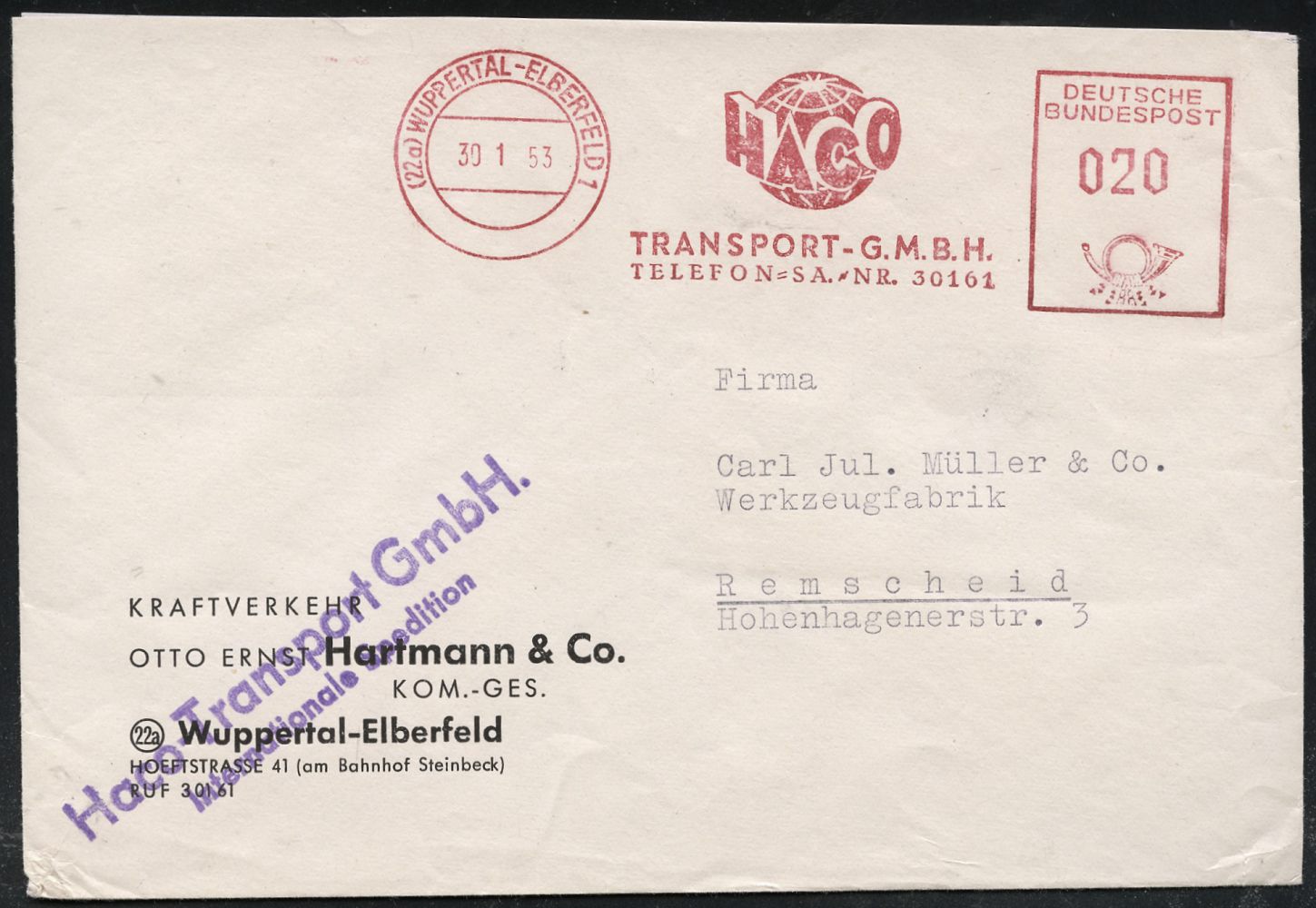 10285 | 15 € | 5600 WUPPERTAL (Absender-Freistempel) : (22a) WUPPERTAL-ELBERFELD 1/ HACO/ TRANSPORT-GMBH.. 1953 (30.1.) AFS Francotyp (Firmenlogo mit Globus) Firmen-Bf. überstempelt mit altem Abs.-Vordruck: KRAFTVERKEHR O. E. Hartmann & Co..., Fern-Bf. (Dü.E-23CGo) | ![]() | |