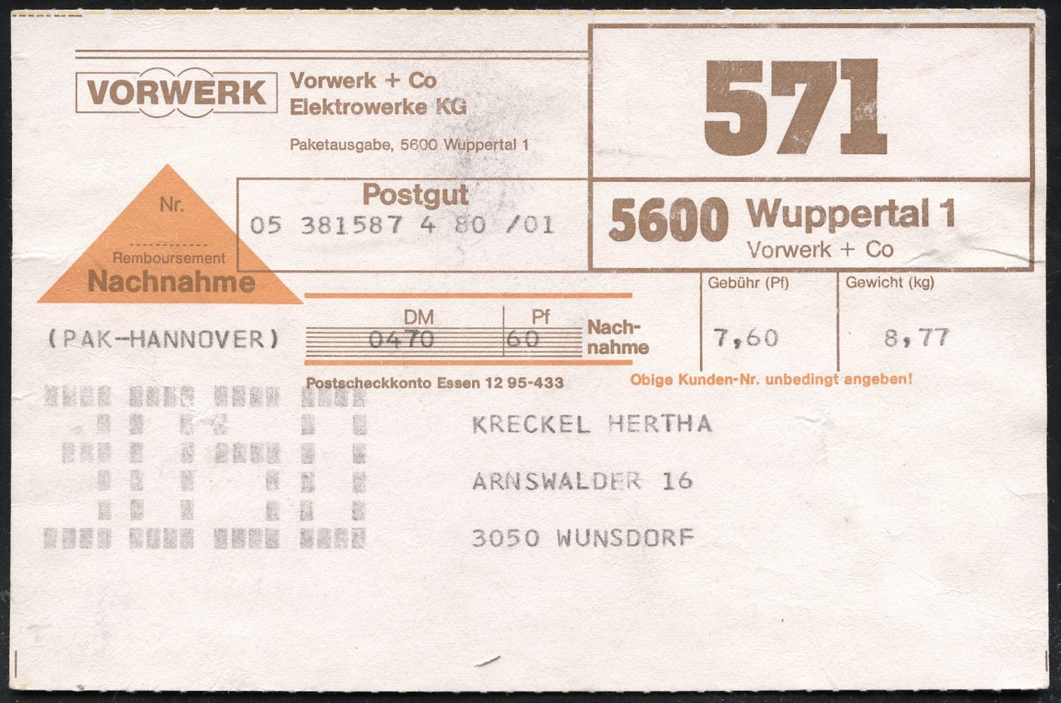 10302 | 15 € | 5600 WUPPERTAL (Absender-Freistempel) : 5600 Wuppertal 1/ Vorwerk + Co 1980 (Jan.) EDV-Paketfreistempel 7,60 (DM) auf Inl.-Selbstbucher-NN-Paketkarte: Vorwerk + co, Elektrowerke KG.., = Postautomations-Beleg, siehe nachfolgende Kat.-Nrn.! | ![]() | |