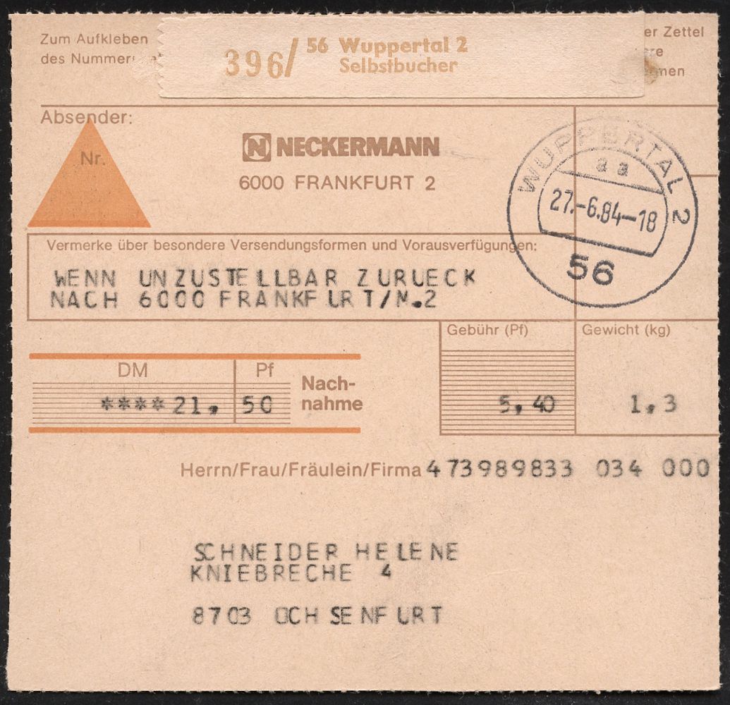 10306 | 10 € | 5600 WUPPERTAL (Absender-Freistempel) : 56 WUPPERTAL 2/ a a 1984 (27.6.) 1K-Segment + brauner Selbstbucher-Paketzettel: 56 Wuppertal 2/ Selbstbucher = Fa. Neckermann 6000 Frankfurt 2 , EDV-Paket-Freistempel 5,40 (DM) mit Unzustellbarkeitsvermerk nach Frankfurt/M. 2, Inl.-NN-Selbstbucher-Paketkarte (n. Ochsenfurt) | ![]() | |
