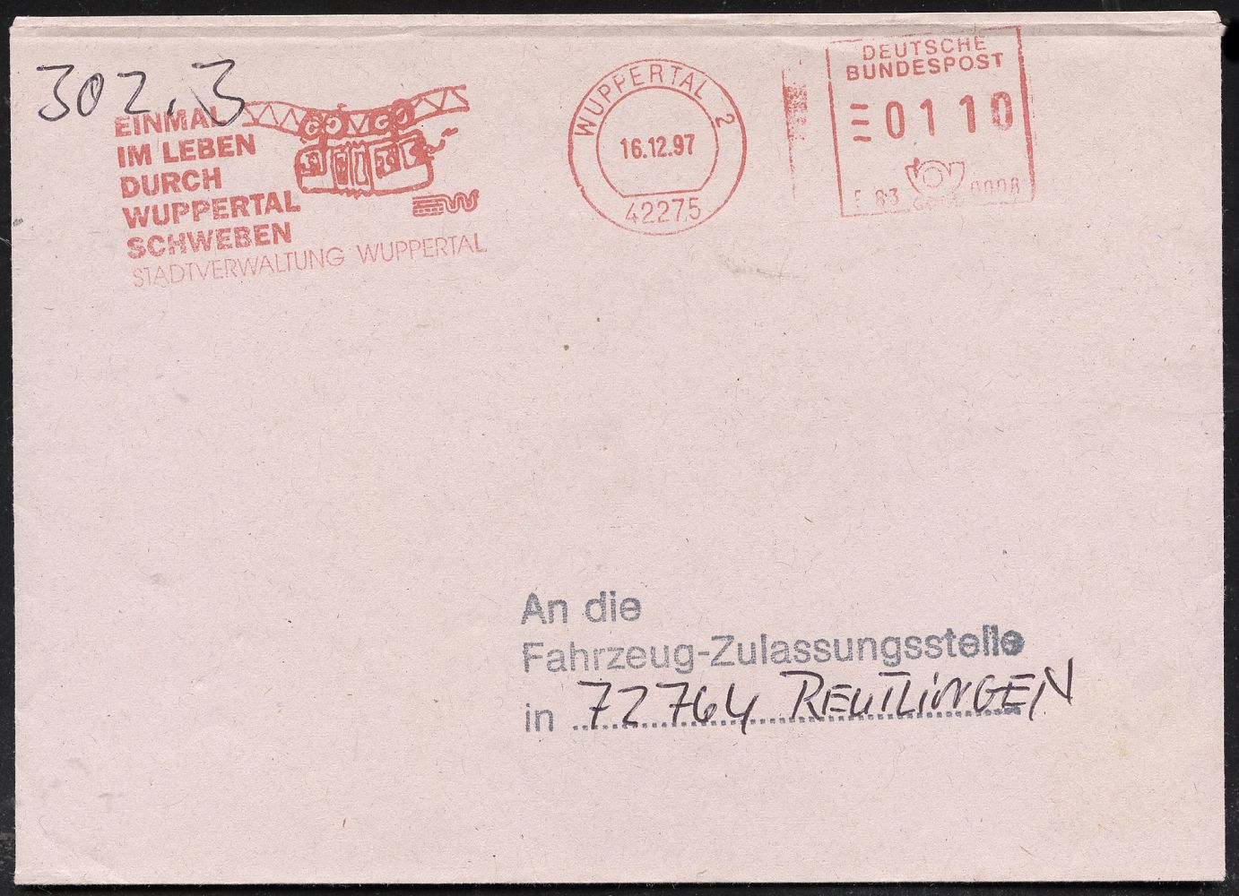 10307 | 5 € | 5600 WUPPERTAL (Absender-Freistempel) : 42275 WUPPERTAL 2/ E 83 0008/ EINMAL/ IM LEBEN/ DURCH/ WUPPERTAL/ SCHWEBEN/ STADTVERWALRUNG.. 1997 (16.12.) AFS Pitney-Bowes mit Kennung (Schwebebahn) Kommunal-Bf. (Dü.E-26E) | ![]() | |
