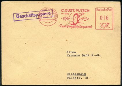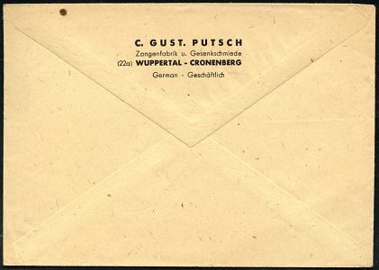 10435 | 16 € | 5650 SOLINGEN (Post- und Absender-Freistempel) : WUPPERTAL-CRONENBERG/ C.GUST.PUTSCH/ ..Zangenwerk 1948 (21.7.) AFS Francotyp "Posthorn" (Beißzange) rs. Abs.-Vordruck, klar gest. Firmen-Bf.: C. GUST. PUTSCH, Zangen- u. Gesenkschmiede "Geschäftspapiere" (Dü.E-20CG) | ![]() ![]() | |