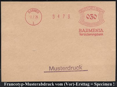 10180 | 35 € | 5600 WUPPERTAL (Absender-Freistempel) : BARMEN/ 1/ BARMENIA/ Versicherungsbank 1926 (2.7.) AFS-Musterabdruck Francotyp "Bogenrechteck" mit großer mittiger Zählnummer , glasklar gest. Francotyp-Musterblatt vom (Vor)-Ersttag !, selten! (Dü.E-1Bm) | ![]() ![]() ![]() | |
