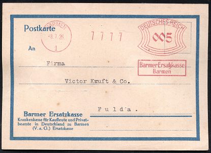 10181 | 25 € | 5600 WUPPERTAL (Absender-Freistempel) : BARMEN/ 1/ Barmer Ersatzkasse.. 1926 (8.7.) früher AFS Francotyp "Bogenrechteck" mit großer, mittiger Zählnummer , Firmen-Kt.: Barmer Ersatzkasse.. mit Verweis auf R.V.O. § 521 (Dü.E-1BAm) | ![]() ![]() ![]() ![]() | |