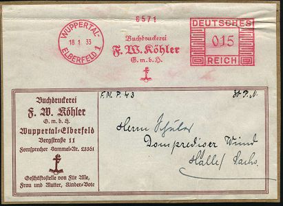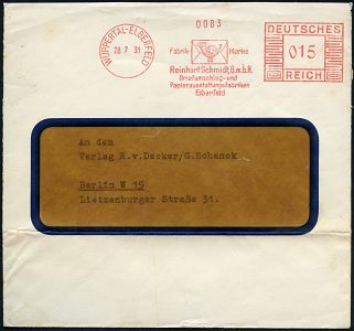 10198 | 25 € | 5600 WUPPERTAL (Absender-Freistempel) : WUPPERTAL-/ ELBERFELD 1/ Buchdruckerei/ F.W.Köhler/ GmbH 1933 (18.1.) AFS Francotyp "Mäanderrechteck" 015 Pf. auf Adreß-Aufkleber, seltene Inl.-Drs. 3. Gew.-Stufe (100 - 250 g) (Dü.E-2CEh) | ![]() | |