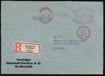 10208 | 30 € | 5600 WUPPERTAL (Absender-Freistempel) : WUPPERTAL-/ ELBERFELD/ GLANZSTOFF 1936 (16.1.) AFS Francotyp "Bogenrechteck" 065 Pf. (Firmen-Logo mit Löwe) + RZ: Wuppertal-/Elberfeld 2 , Firmen-Ausl.-R-Bf. n. Prag = Sondertarif CSR!, seltene Portostufe! (Dü.E-1Am) | ![]() ![]() | |