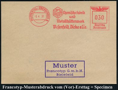 10221 | 35 € | 5600 WUPPERTAL (Absender-Freistempel) : WUPPERTAL-OBERBARMEN 1/ Chemische Fabrik/ und/ Metallhüttenwerk/ Wesenfeld,Dicke & Cie. 1937 (5.4.) AFS-Musterabdruck Francotyp "Reichsadler" (Firmen-Logo: Würfel)) glasklar gest. Francotyp-Musterblatt vom (Vor)-Ersttag!, selten! (Dü.E-5CGo) | ![]() ![]() | |