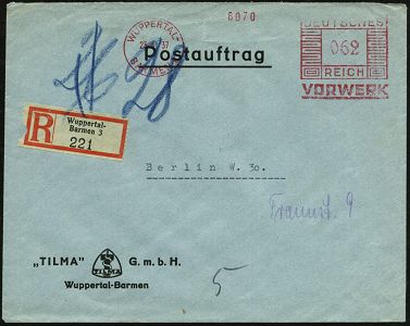 10222 | 30 € | 5600 WUPPERTAL (Absender-Freistempel) : WUPPERTAL-/ BARMEN/ VORWERK 1937 (23.4.) AFS Francotyp "Mäanderrechteck" 062 Pf. + RZ: Wuppertal-/Barmen 3 , Firmen-Bf.: "TILMA" GmbH = Firma für elektrotechnische Apparate etc., Fern-Postauftrags-R-Bf., seltene Portostufe! (Dü.E-2CEh) | ![]() | |