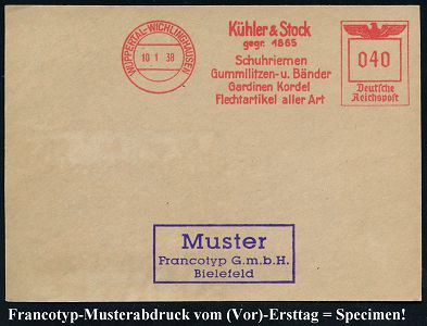10234 | 35 € | 5600 WUPPERTAL (Absender-Freistempel) : WUPPERTAL-WICHLINGHAUSEN/ Kühler & Stock/ gegr,1885/ Schuhriemen/ Gummilitzen- u.Bänder/ Gardinen Kordel/ Flechtartikel.. 1938 (10.1.) AFS-Musterabdruck Francotyp "Reichsadler" , glasklar gest. Francotyp-Musterblatt vom (Vor)-Ersttag !, selten! (Dü.E-5CGo) | ![]() ![]() | |