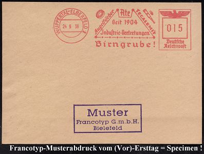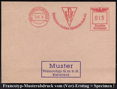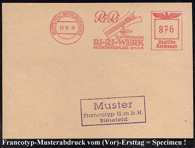 10243 | 35 € | 5600 WUPPERTAL (Absender-Freistempel) : WUPPERTAL-WICHLINGHAUSEN/ ..RI-RI-WERK/ PATENTVERSCHLUSS GmbH 1938 (25.10.) AFS-Musterabdruck Francotyp "Reichsadler" (Patent-Reißverschluß) glasklar gest. Francotyp-Musterblatt vom (Vor)-Ersttag !, selten! (Dü.E-5CGo) | ![]() ![]() | |