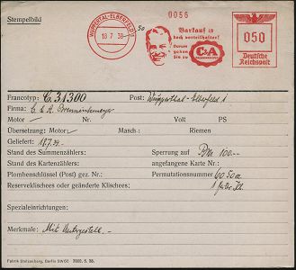 10248 | 50 € | 5600 WUPPERTAL (Absender-Freistempel) : WUPPERTAL-ELBERFELD 1/ Barkauf../ C & A/ BRENNINKMEYER 1939 (18.7.) AFS Archivmuster "Reichsadler" 050 Pf. (lachender Männerkopf) auf postamtlicher Archivkarte mit hs. Inschrift der Maschinennr. "C 31 300" + weitere hs. Daten, seltenes Unikat!, vergl. Kat.-Nr. 10249 (Dü.E-5CGh) | ![]() | |