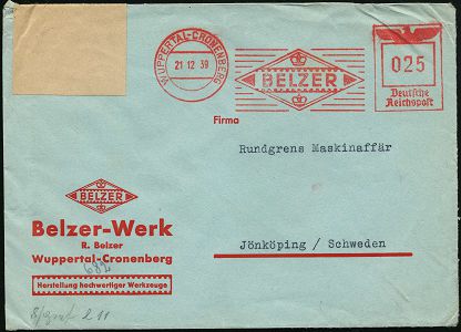 10254 | 30 € | 5600 WUPPERTAL (Absender-Freistempel) : WUPPERTAL-CRONENBERG/ BELZER 1939 (21.12.) AFS Francotyp "Reichsadler" 025 Pf. (Firmenlogo mit 2 Kronen) rs. OKW-Zensurstreifen "Geprüft", noch o h n e Prüfstempel! (= Berlin, B-51, + 50 Pkte.) motivgl. Ausl.-Zensur-Bf. n. Schweden (Dü.E-5CGo) | ![]() ![]() | |