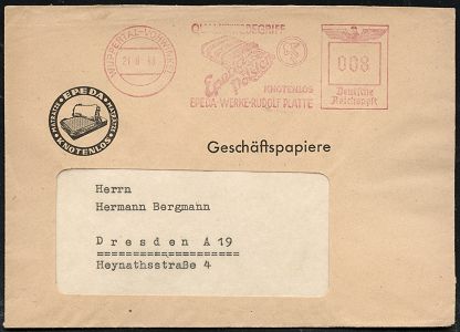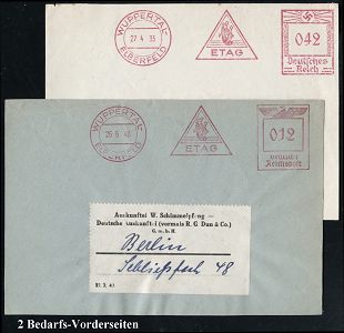 10203 | 20 € | 5600 WUPPERTAL (Absender-Freistempel) : WUPPERTAL-/ ELBERFELD/ ETAG 1935/40 2 verschiedene AFS Francotyp "Hakenkreuz" bzw. "Reichsadler" (je Firmenlogo: Segelschiff mit Sternen = E(lberfelder) T(extilwerke) AG) je auf Bedarfs-Vorderseite, 2 Belege (Dü.E-3CEo, E-5CEo) | ![]() | |