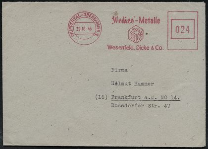 10267 | 25 € | 5600 WUPPERTAL (Absender-Freistempel) : WUPPERTAL-OBERBARMEN 1/ "Wedico"-Metalle/ Wesenfeld,Dicke & Co 1946 (11.11.) aptierter AFS Francotyp "Reichsadler" + Inschrift "Deutsche Reichspost" = entfernt = Notmaßnahme! (Logo: Metallwürfel) rs. viol. Abs.-3L: Claus Gerd Dicke.., klar gest. Fern-Bf. (Dü.E-13E-109o) | ![]() | |
