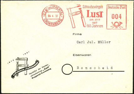 10281 | 18 € | 5600 WUPPERTAL (Absender-Freistempel) : (22a) WUPPERTAL-/ CRONENBERG/ Schraubzwingen/ Lust/ DIN 5117.. 1951 (4.4.) AFS Francotyp (= DIN-Schraubzwinge) dekorativer, motivgl. Reklame-Bf.: Lohmann & Stuhlmann, seltenes Motiv! (Dü.E-20CG) | ![]() | |