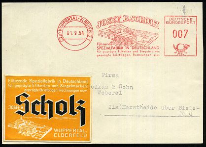 10287 | 20 € | 5600 WUPPERTAL (Absender-Freistempel) : (22a) WUPPERTAL-ELEBERFELD 1/ J.B.SCHOLZ/ ..SPEZIALFABRIK../ f.geprägte..Siegelmarken.. 1954 (1.9.) AFS Francotyp= Fabrik = Druckerei für Werbemarken, Vignetten u. Siegelmarken + gelb-schwarze Präge-Reklame-Vignette, dekorative Firmen-Kt.! (Dü.E-23CO) | ![]() | |