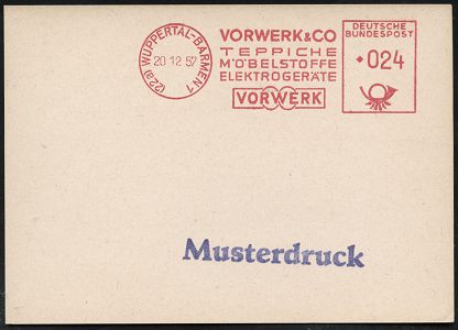 10289 | 20 € | 5600 WUPPERTAL (Absender-Freistempel) : (22a) WUPPERTAL-BARMEN 1/ VORWERK & CO/ TEPPICHE/ MÖBELSTOFFE/ ELEKTROGERÄTE 1957 (20.12.) AFS 024 Pf., Francotyp-Archivmuster (Firmen-Logo) + blauer 1L: "Musterdruck", seltene Francotyp-Archivkt.!, minimale Auflage! (Dü.E-23DO) | ![]() | |